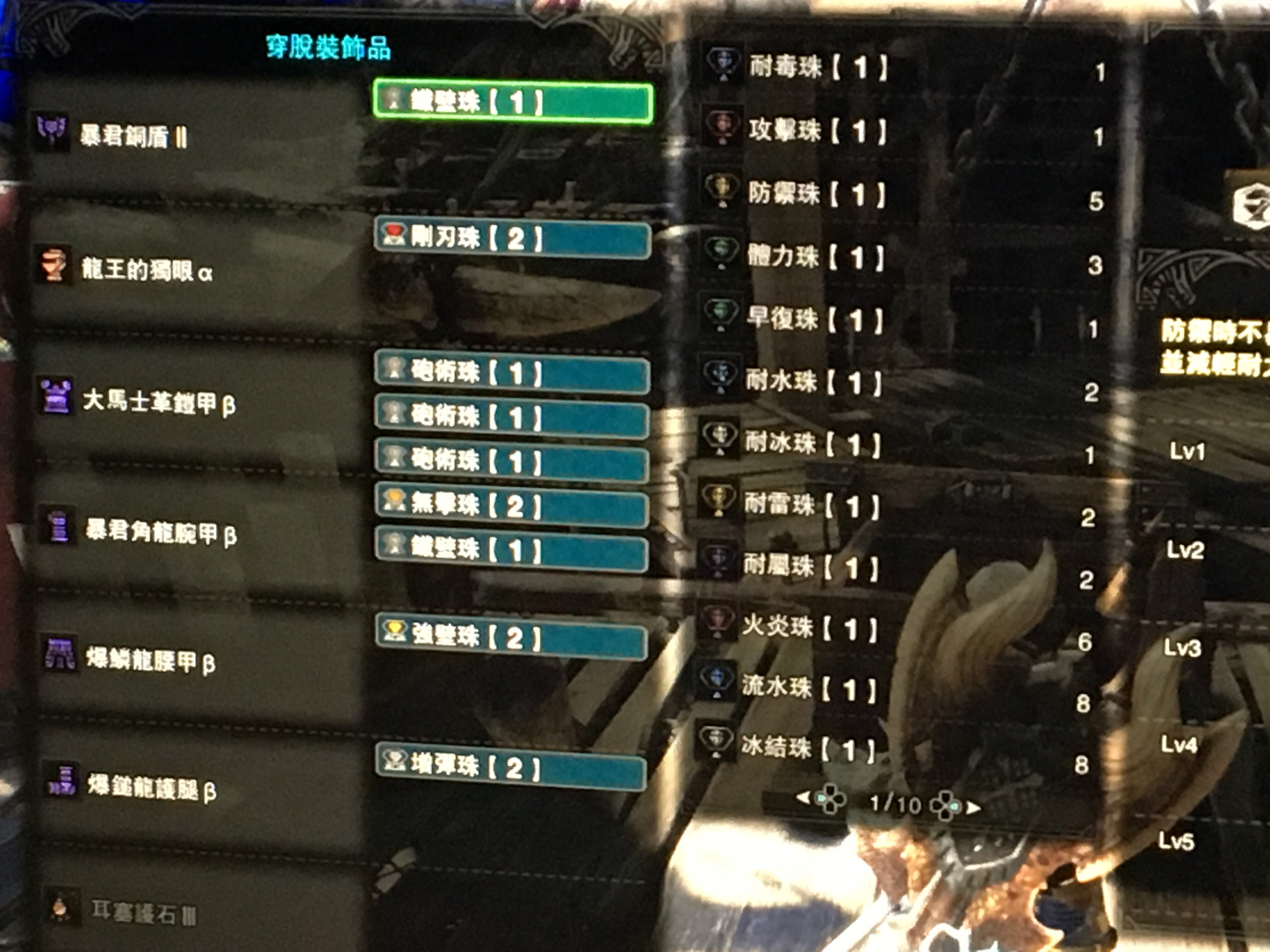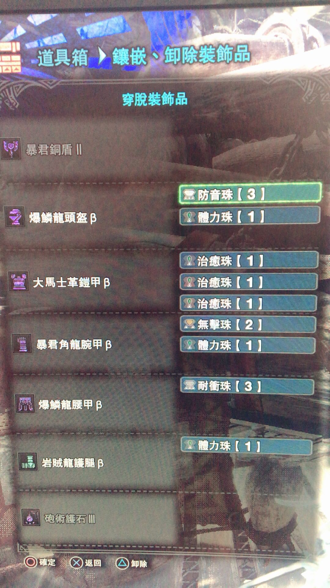 把头和鞋 护符换了可以出匠5 感觉弱特用处不大 我没有铁壁珠所以暂时带爆锤鞋 理想应该是 爆麟头 大马士衣 黑角手 爆麟腰带 死神鞋 匠护士 炮术珠 增弹 无击 铁壁