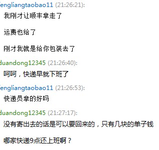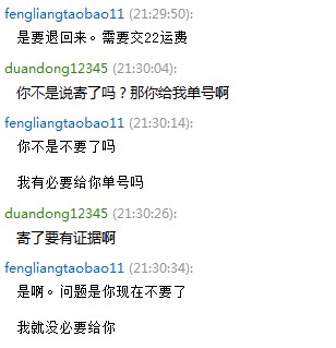 申请退款以后,他马上露出了骗子的本质:当时我是晚上九点多拍下的,过了几分钟就申请了退款。这时他不退款,说已经快递寄出了。。。呵呵,哪家快递晚上九点半还工作呢?下面上截图: