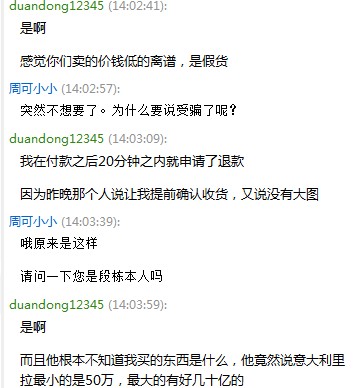 接下来我给他打了个电话,一打电话,我的心都凉了。我问他不会是假的吧?骗子说要真的有真的要假的有假的。后来我又问他,旧的也有假的?他说:这简单做旧呗,我认识人。我说有小面值的里拉么?他说500000是最小的了,大的有几十亿的。听到这我觉得我肯定被骗了,就赶紧申请退款。。。