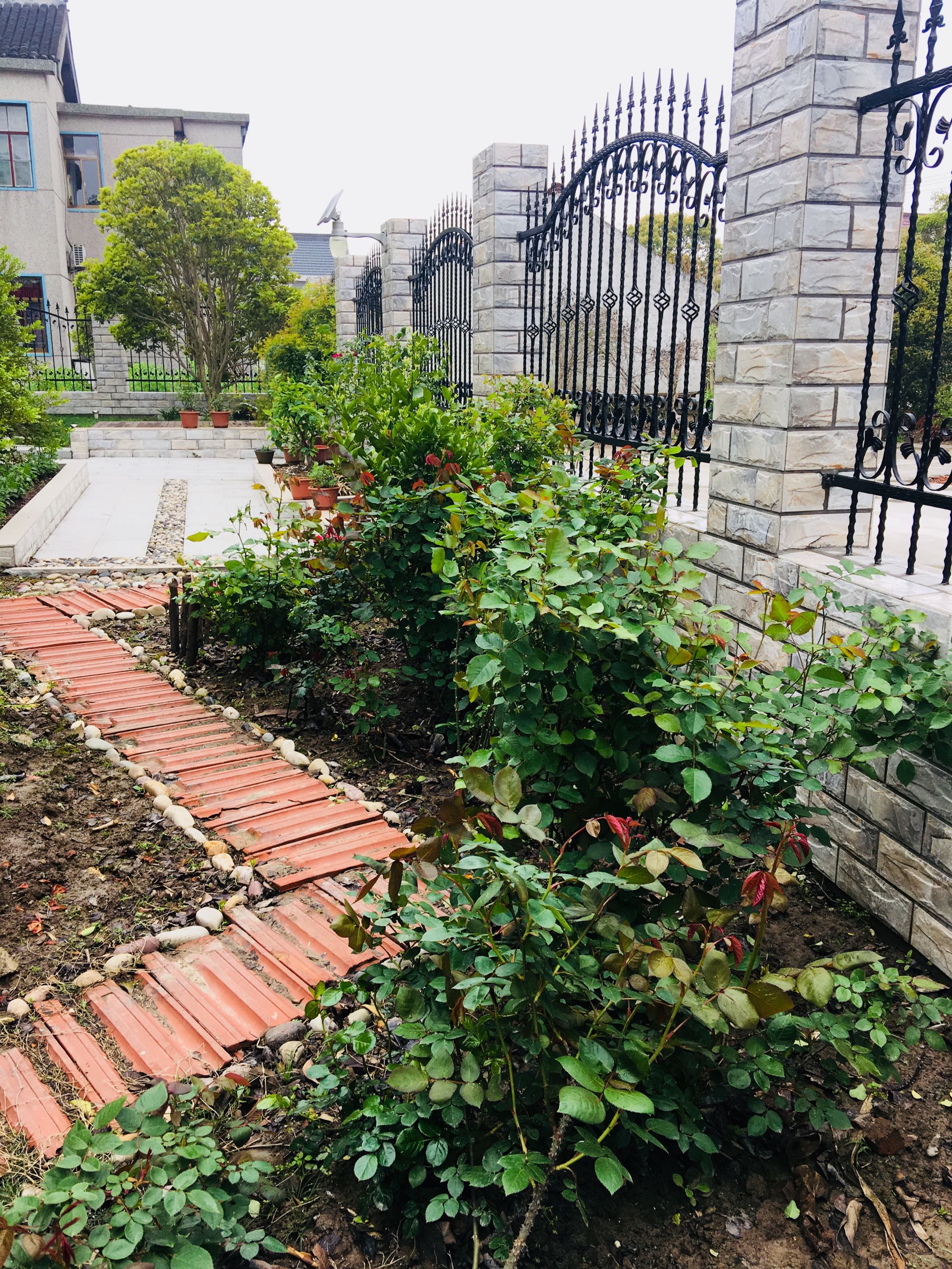 外面最好种一季木香之类的或者刺多的品种遮挡一下视线。要知道农村的花照样有人偷的。