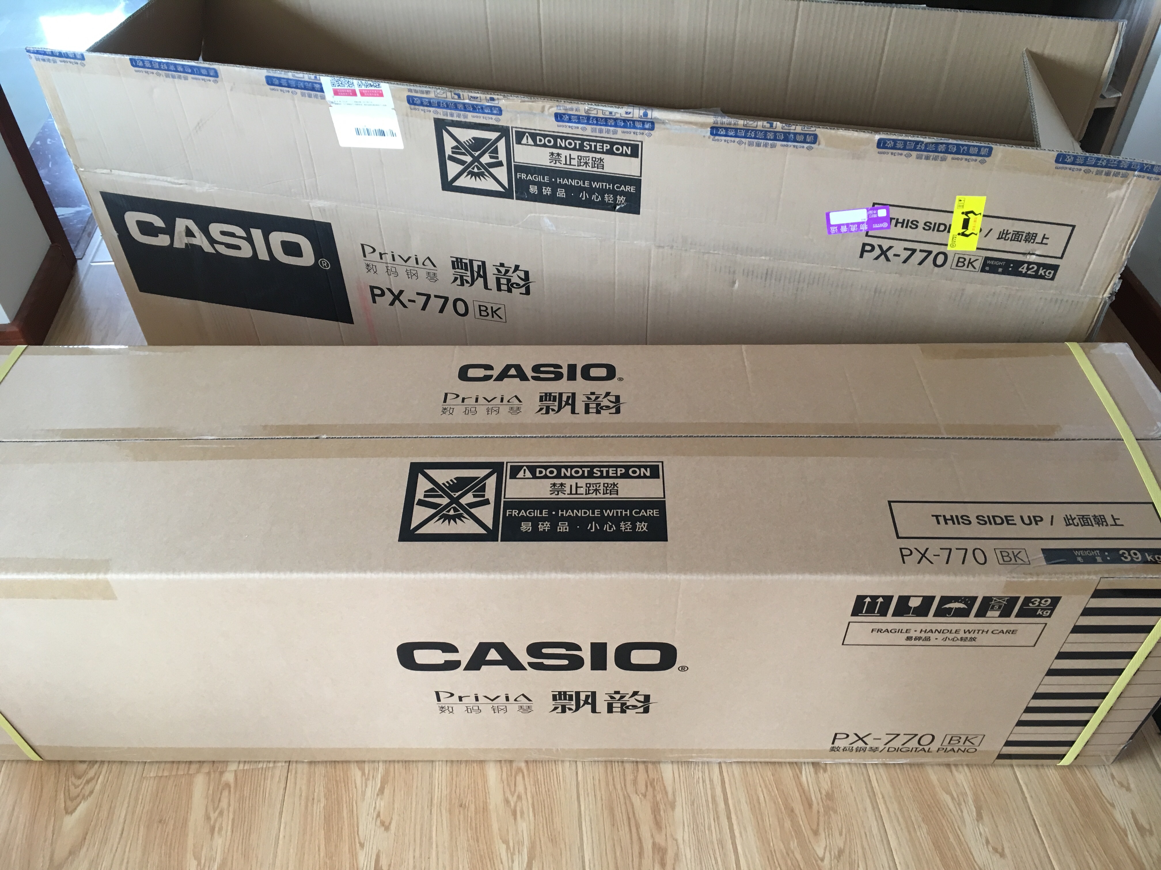 大箱里面套小箱,包装很好;板材很重,如图是密度板?我也不懂;脚踏是塑料的;琴的厚度30厘米,组合完成的效果符合我的预期。完全零基础,对琴音色、手感等等一切毫无发言权