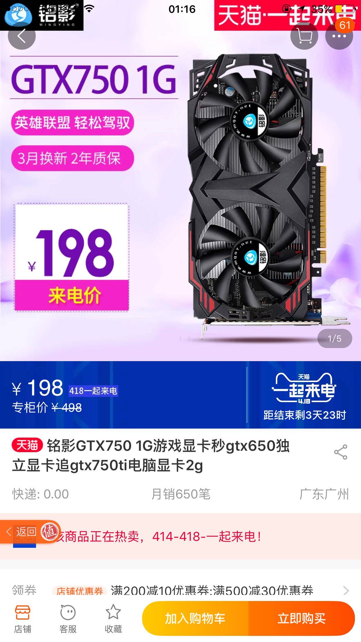 要不要我150福利你一张自用的七彩虹 750 2G显卡,走咸鱼,不包邮,9新,今天刚好新显卡到了,准备拆了