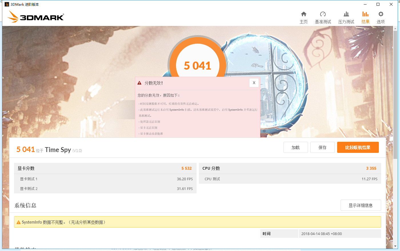 3Dmark测试完显示未启用SystemInfo,分数无效什么鬼
