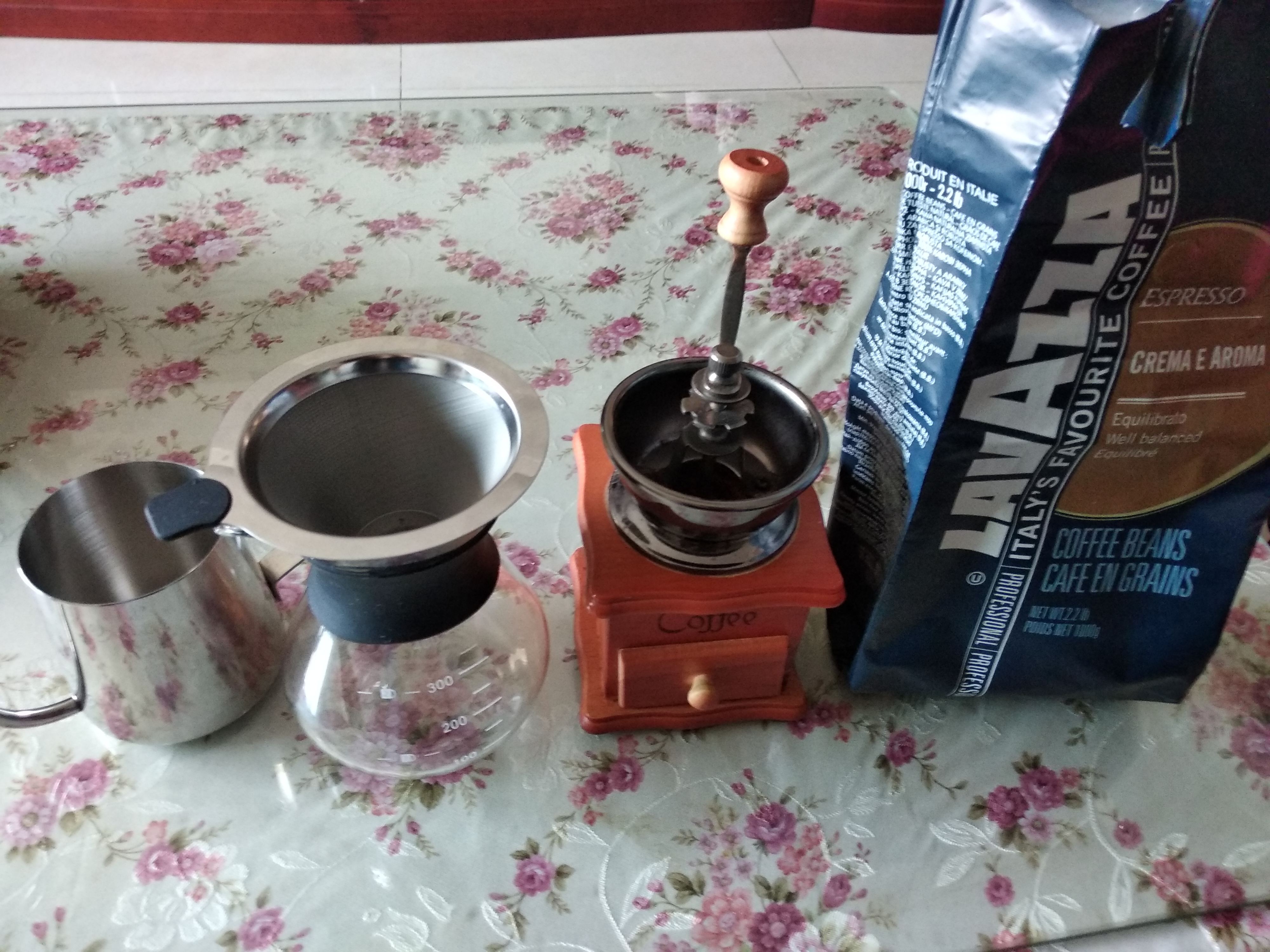 第一步,磨豆子 手摇磨豆器把豆子磨成粉,当然买咖啡豆的时候可以让卖家直接发豆粉,不过气味容易挥发,不易保存,豆子可以存久一些,喝的时候在磨。也有电动磨豆机喝全自动咖啡机,不过那样就没意思了。这种是最简单的磨豆器,上头的螺丝可以控制豆粉的粗细,在口感上也有些差别。
