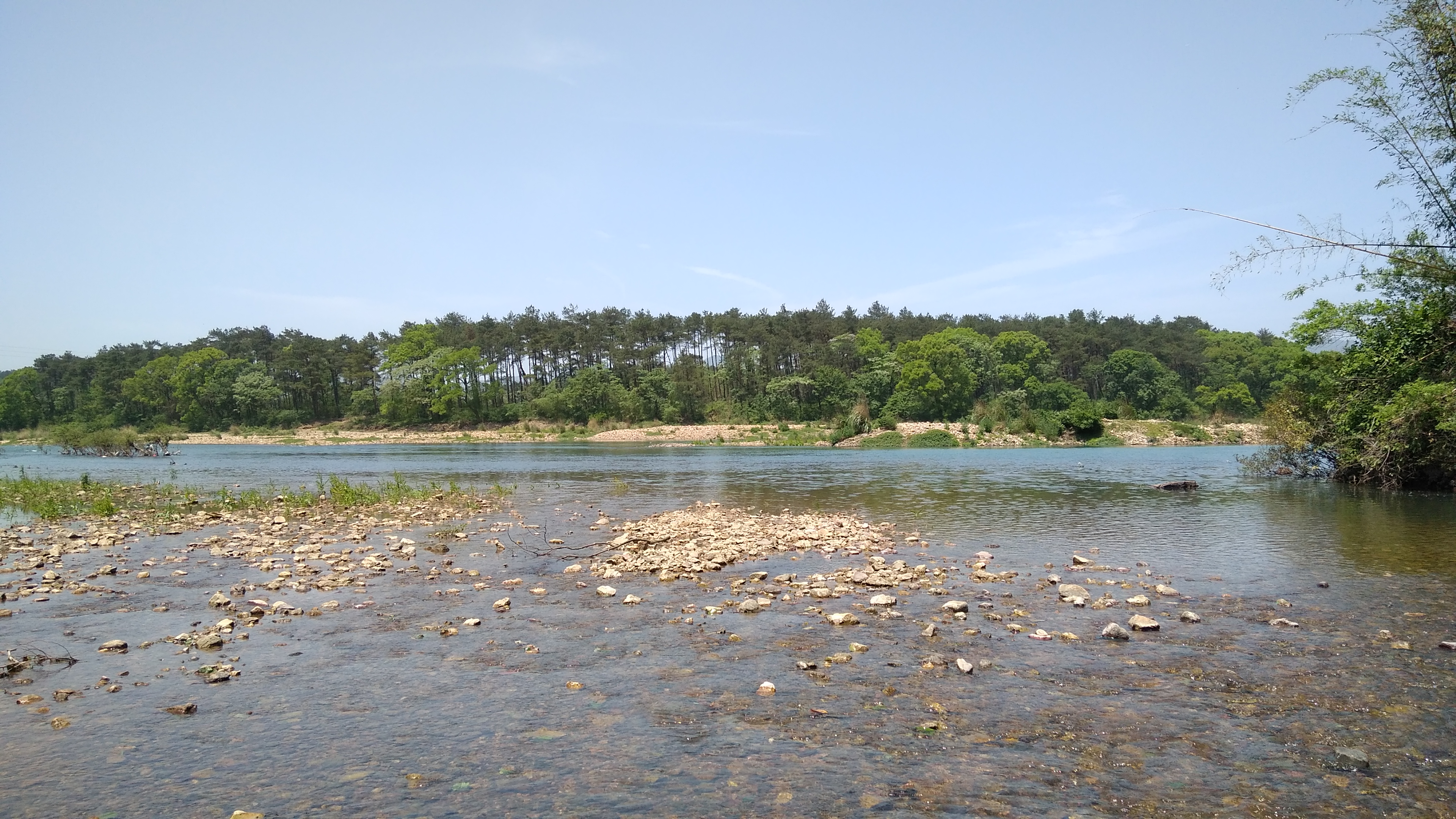 河滩上水管就是当年大跃进时代的产物 现在还发挥作用 推车上岸后 沿着小树林土路前进 尽管漓江上游由于曾经挖沙 很多河段支离破碎 但这里工业少 污染小 水质还不错