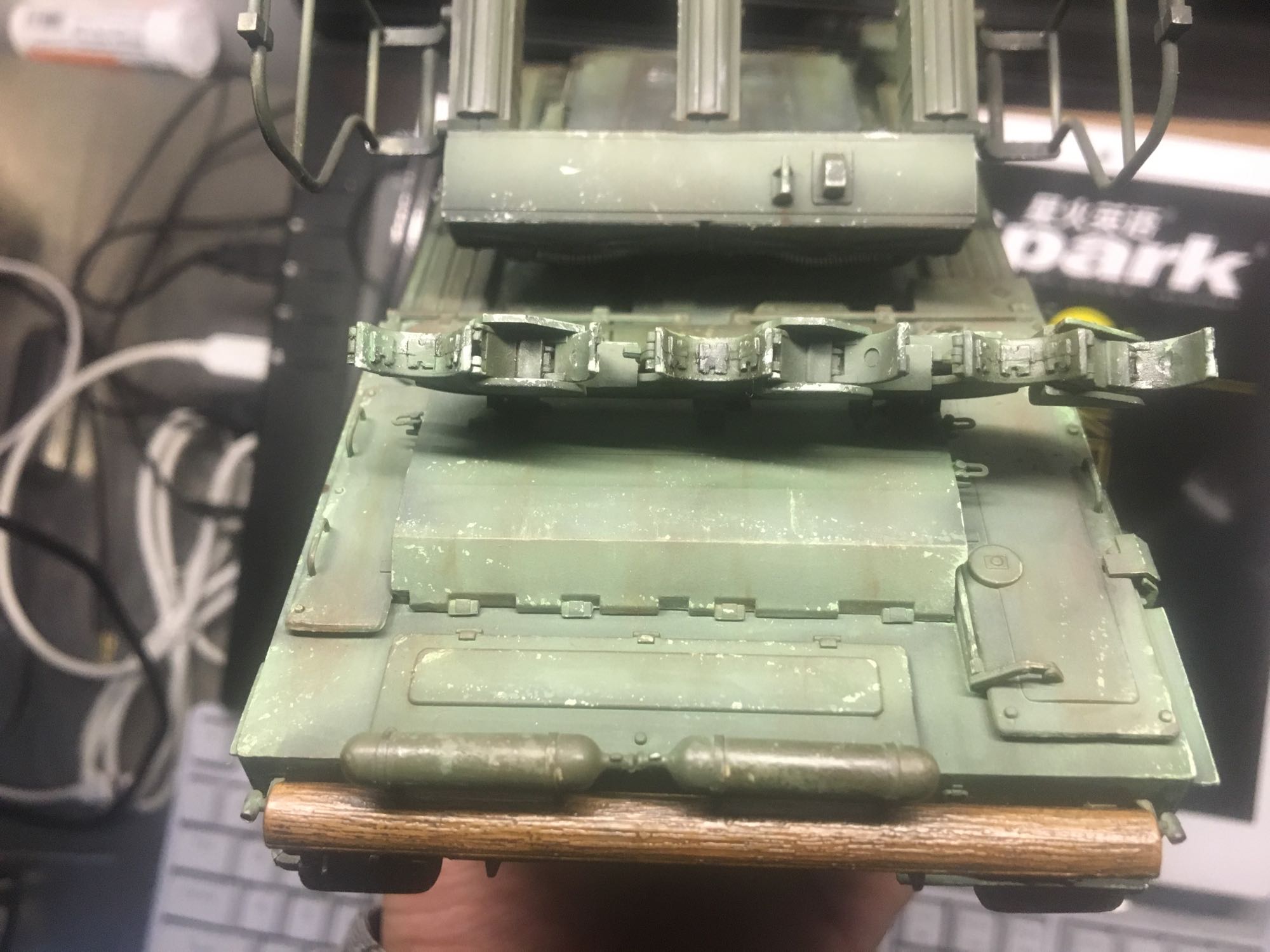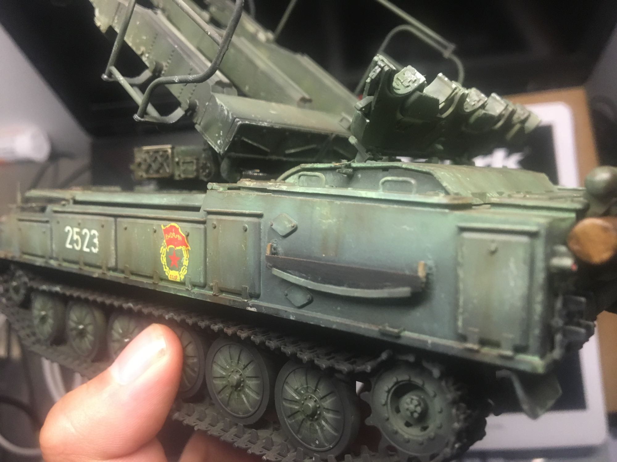 萌新初尝旧化,因为是民主德国的阅兵式版本,只是轻度旧化了一下,土啥的就不上了,zippo油感觉没法彻底溶解温莎牛顿,漆面还毛,一点就散开了,于是先喷了一层光油,然后点完后用毛笔沾了zippo又擦拭了一遍,还好没化漆,但是半瓶油没了,自己估计也吸了不少,折寿啊。。。和原图对比发现导弹的颜色不太对,车体颜色偏浅,难道不是C136?总觉得哪里不对劲,求老师们指点一下