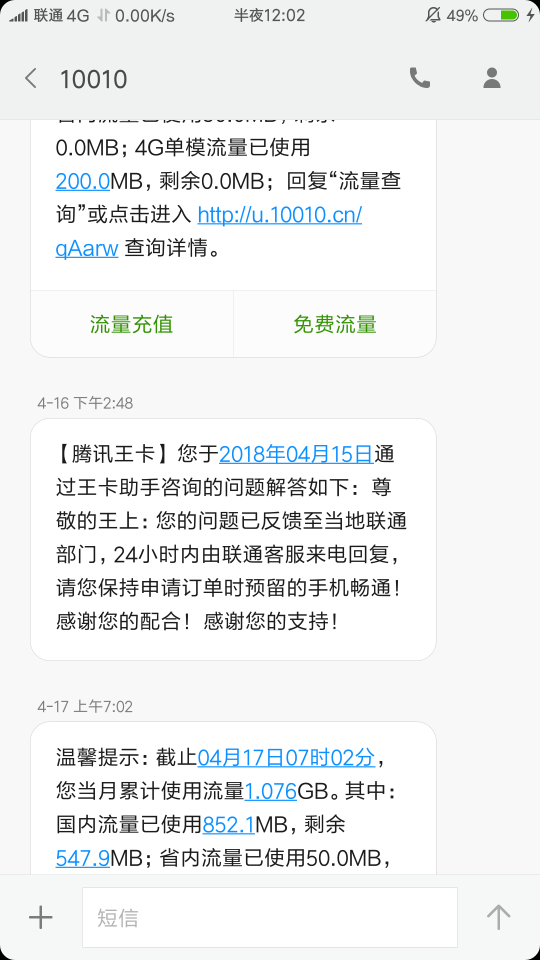 4月12号用qq看热点花了90m没有给我免。大王卡微信公用号申诉无果说给我打电话也没打。今天晚上从qq上下文件有没走免流,流量提示短信一个接着一个。服气了。看截图。还有大家都是怎么维权的?