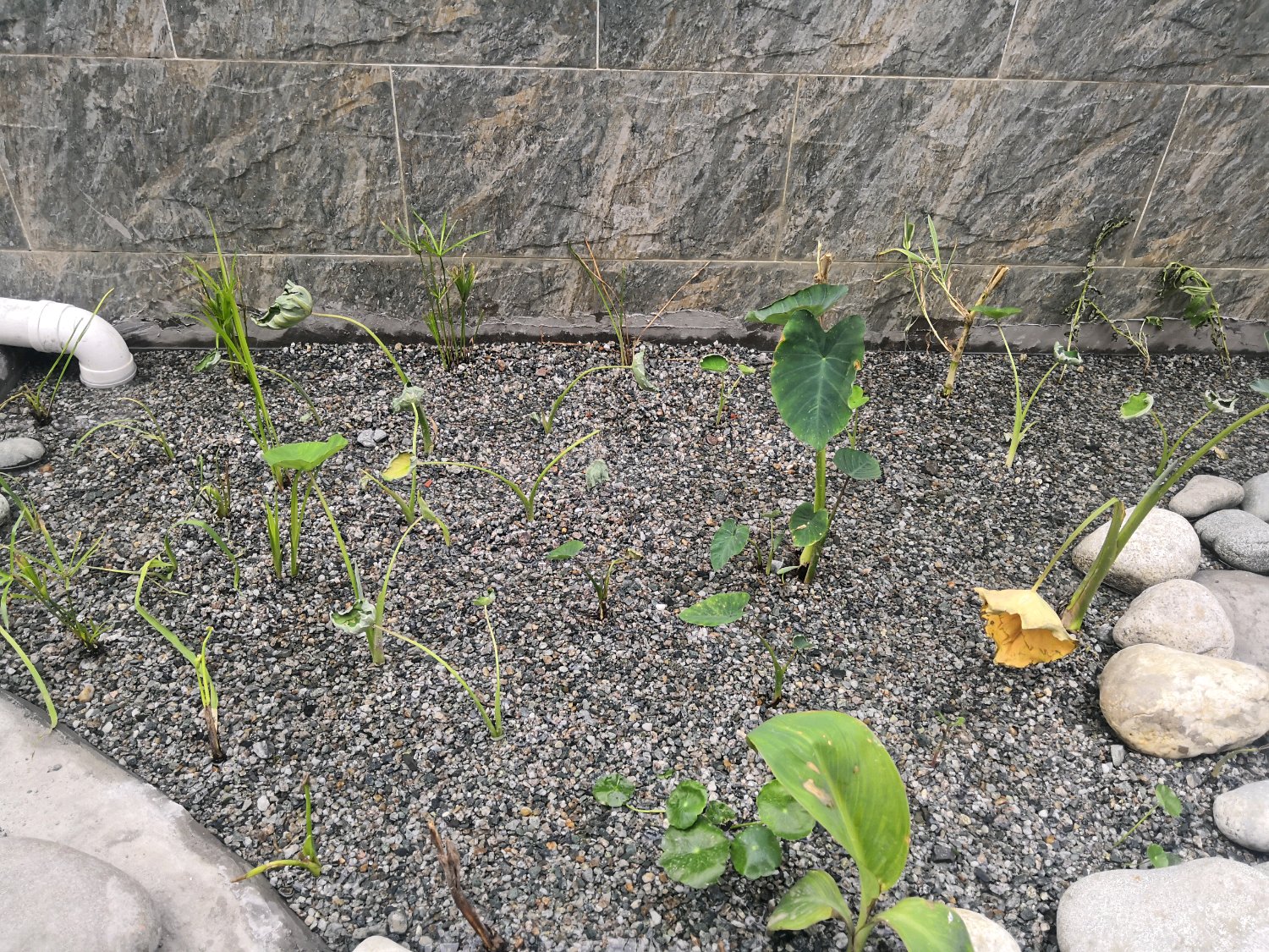 这个池子有点问题,右边深,左边浅,大约差11公分,总深度只有65-70深,我想在中间挖个1200*1500左右的椭圆,再重新做防水(以前有点漏水)。右边那颗树的位置,我准备弄来做沼泽床(1米2宽,准备弄2.5-3米长。框架性方案可行不?
