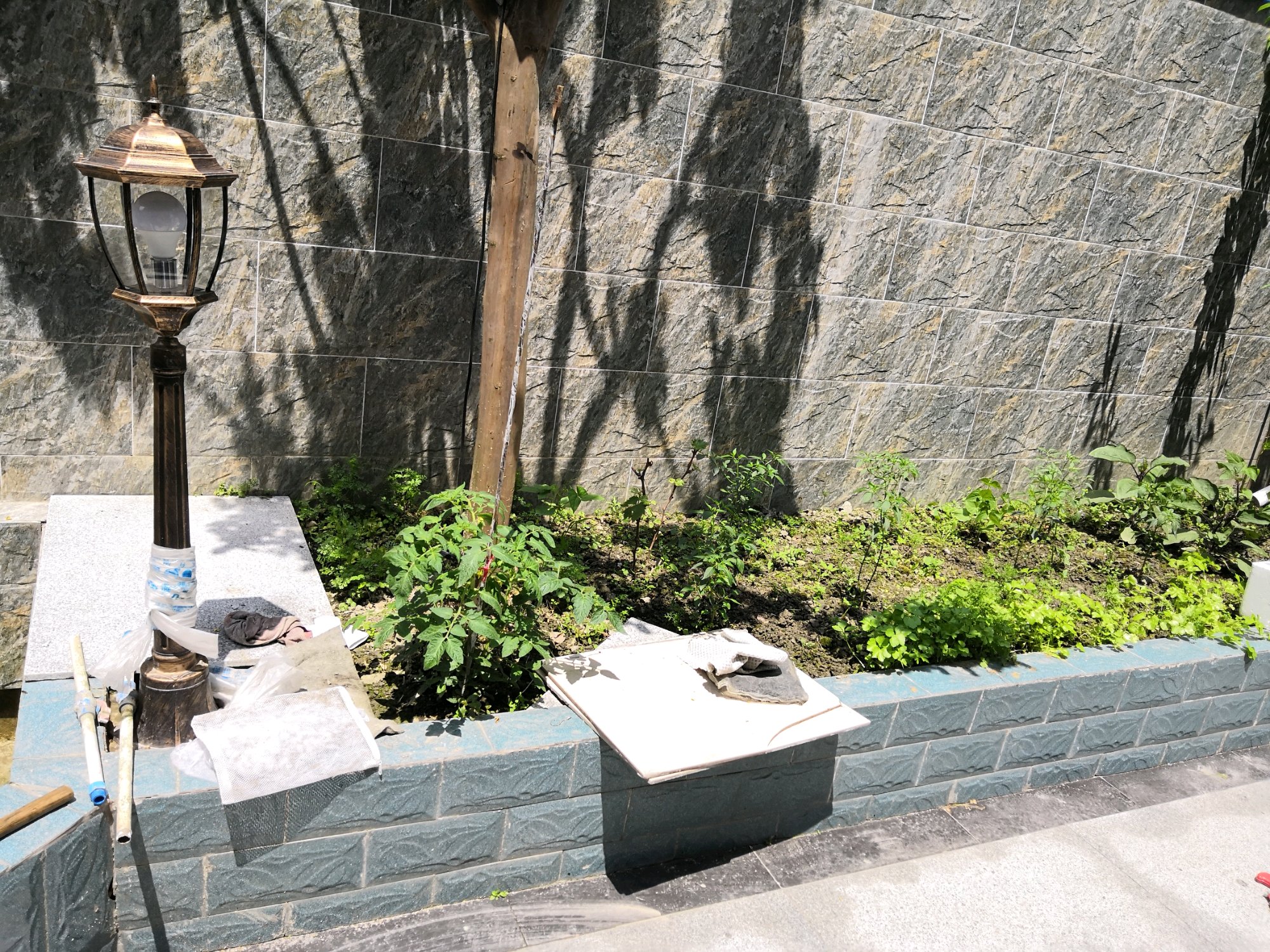 好的,花台部分原来砌的砖刚好高出地面40公分左右,直接把里面的土挖平就差不多。
