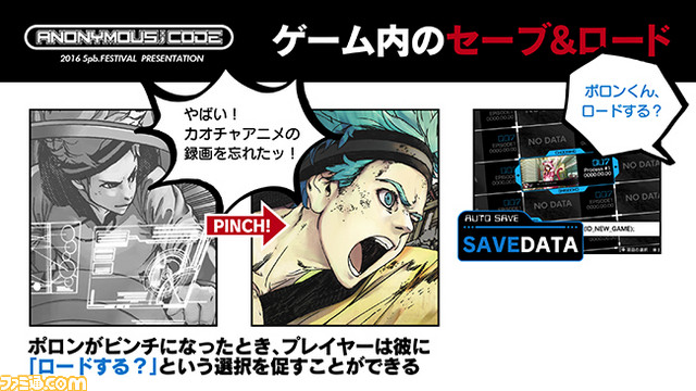首先,我来说明一下本作的独特系统“存档&读档”。大家平时在RPG和ADV等游戏中,都很熟悉如果失败了就可以回到存档点、重新来过的操作。如果现实世界中也能做到这件事,大家不觉得很棒吗?无论是公司里还是学校内,在各种各样的场景中有了不好的预感之后,马上就可以存档人生的话,真是太棒了!如果可以的话我也想保留青春时代的存档数据呢……(笑)嘛,总之,在登场人物——步论他们的现实世界中,这件事是可能的。举个例子,如果主人公步论的某次重要的黑客行动失败了,有人遭到了不幸、甚至失去了性命。如果在事前留下了存档数据,就可以重来。虽然我在ADV游戏中很喜欢轮回类的游戏,也因此诞生了命运石之门这部作品,但Anonymous;code的主人公步论所拥有的“存档&读档”能力和时间旅行或者时间跳跃是完全不同的事物。如果要简要说明哪里不同,那就是,“存档&读档”能力是宇宙规模的推倒重来的能力,所以不会产生所谓的时间悖论。虽然这也是一种轮回类,但和时间旅行系的游戏相比,在故事的撰写上存在着很大的区别。