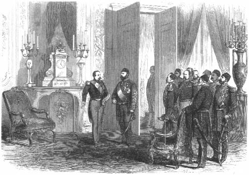 其中的俄国沙皇亚历山德二世作为法国最重视的贵客,在1867年6月10日杜勒丽宫举行的晚宴,以沙皇与法国皇后欧仁妮为中心人物,法国画家埃尔文创作了华丽的君主合影,在画作中盛装的瓯仁妮挽着沙皇,她及背景的其他宫廷仕女的礼服纪录了1867年当时欧洲时装从圆蓬的库里诺林裙式改为修长直綫几呈三角形状的时装潮流,两人身后则是拿破崙三世及普鲁士国王威廉一世。