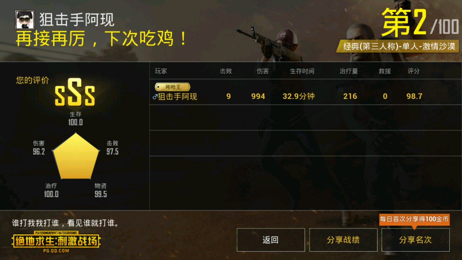 又一把第二。。。甲不行对枪看运气了。。。好几把老二了。。。