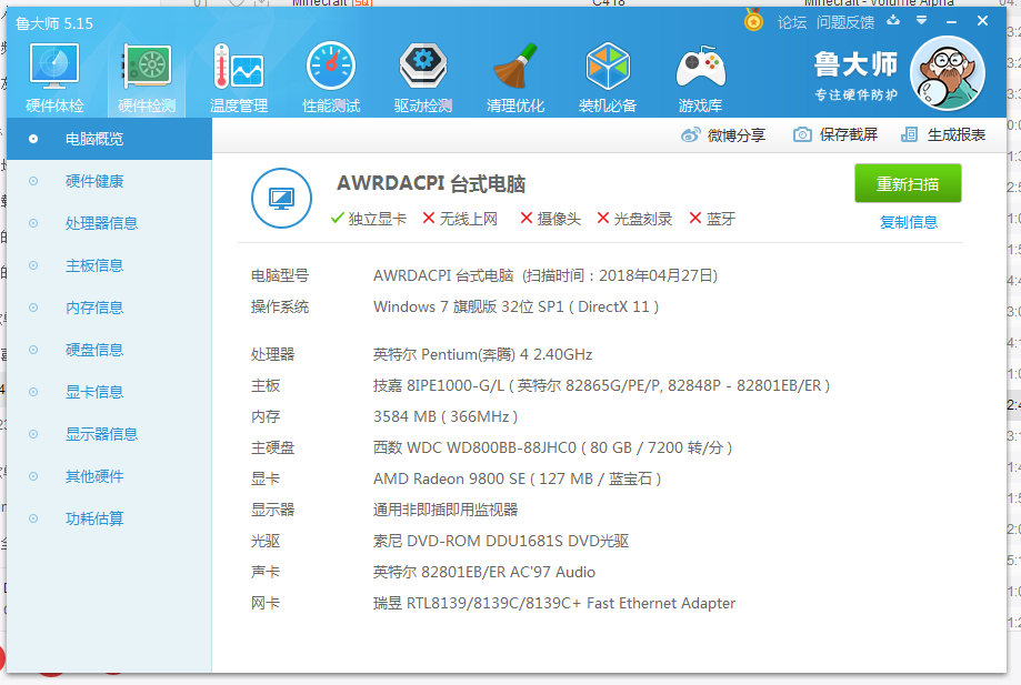 很想把我的奔腾3 600+i810+sd64m+10g硬盘拿出来跑个鲁大师