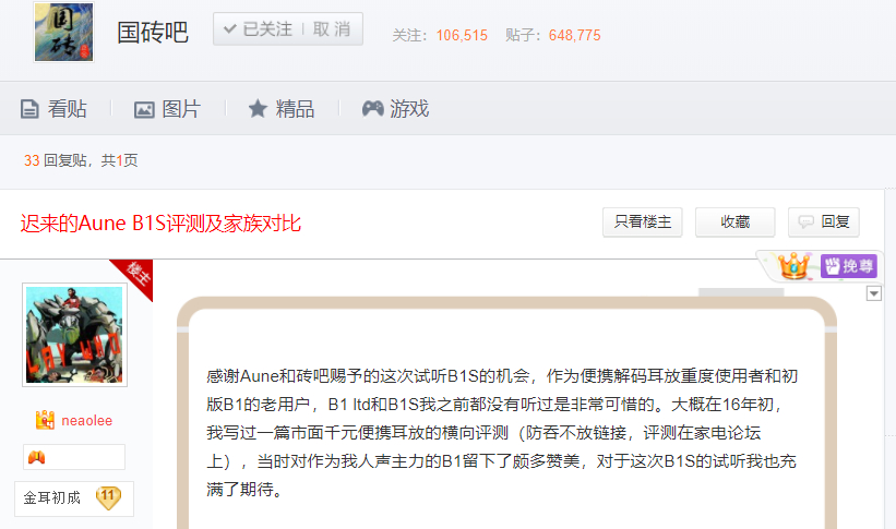 感谢Aune和砖吧赐予的这次试听B1S的机会,作为便携解码耳放重度使用者和初版B1的老用户,B1 ltd和B1S我之前都没有听过是非常可惜的。大概在16年初,我写过一篇市面千元便携耳放的横向评测(防吞不放链接,评测在家电论坛上),当时对作为我人声主力的B1留下了颇多赞美,对于这次B1S的试听我也充满了期待。