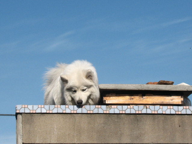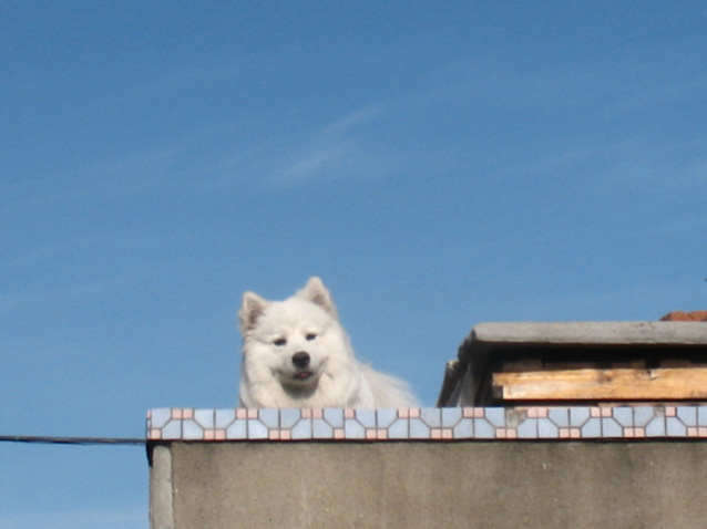 在我的怂恿下爬到了平房顶上,旁边是蜂箱,呵呵,不知道蜜蜂厉害的tina还很好奇呢。