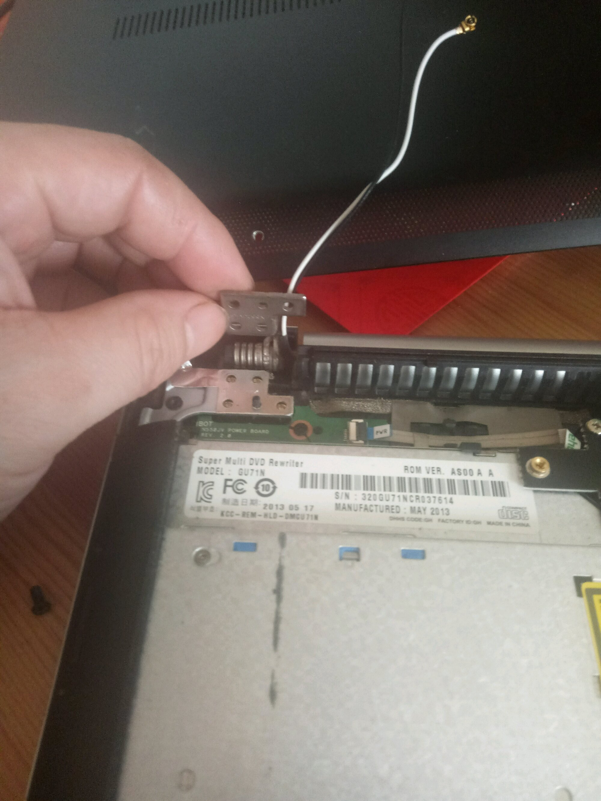 N550换无线网卡第二步换天线,蘑菇头方向滑一下盖子就下来了