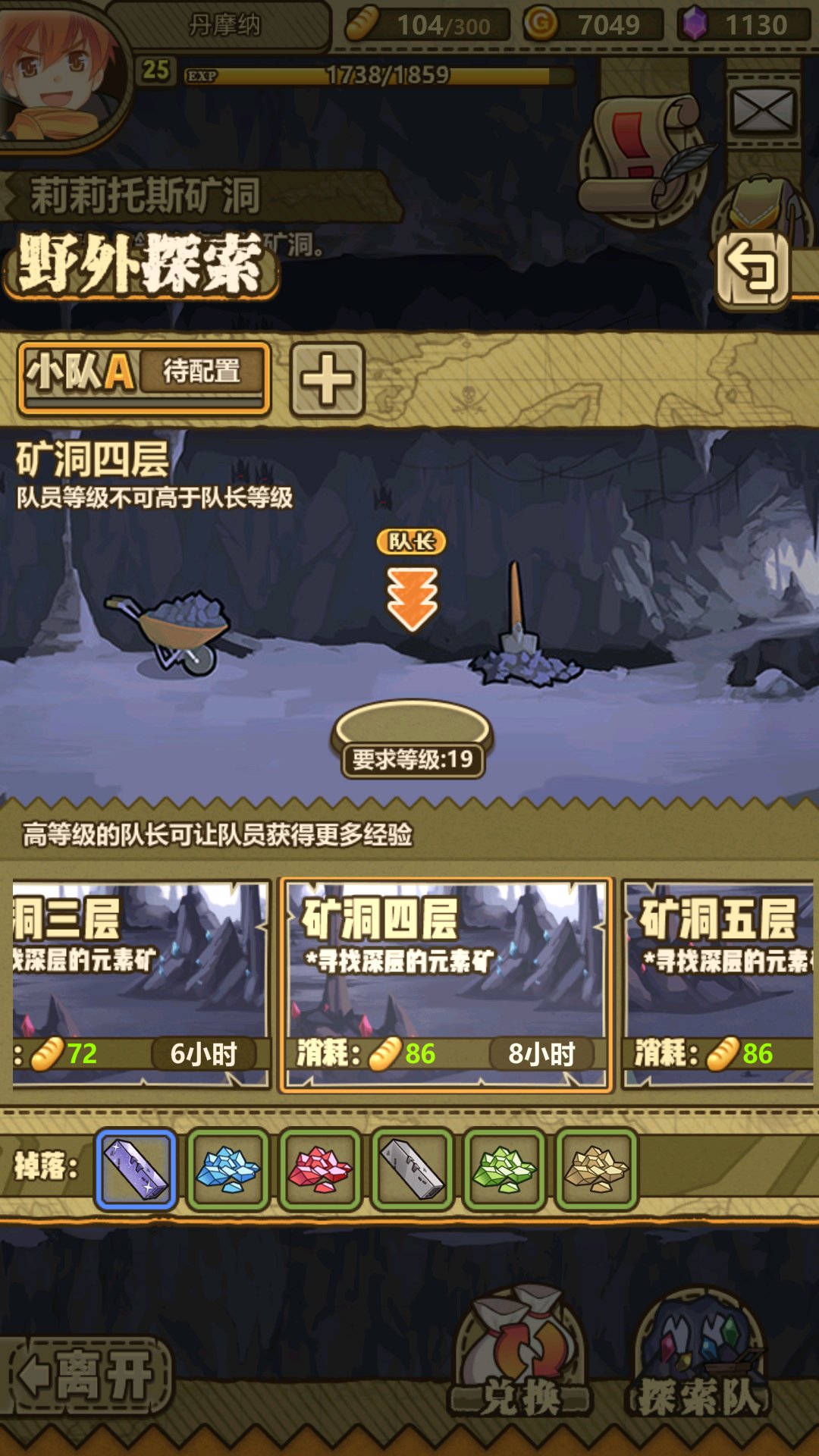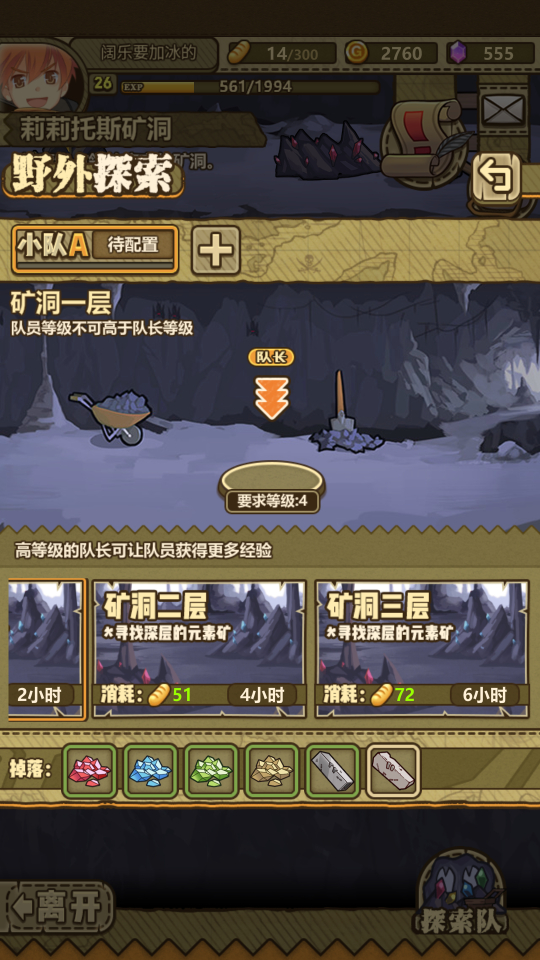 探索一次矿洞三层,探索完开四层矿洞,四层矿洞有个怪,打完就可以挖矿了