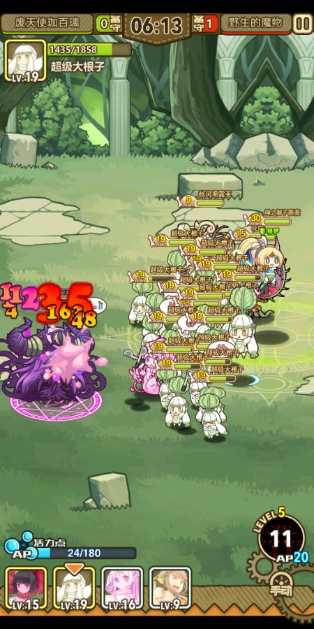 你只需要,一个,19级的带不带自爆甲都无所谓的,带香囊和武器的大根子,以及一系列等级足够的酱油成员。操作如下:手动,从头至尾只使用一个技能——大根子的分身,其他技能都别用了,然后看着妖精们自动平A,结束战斗。