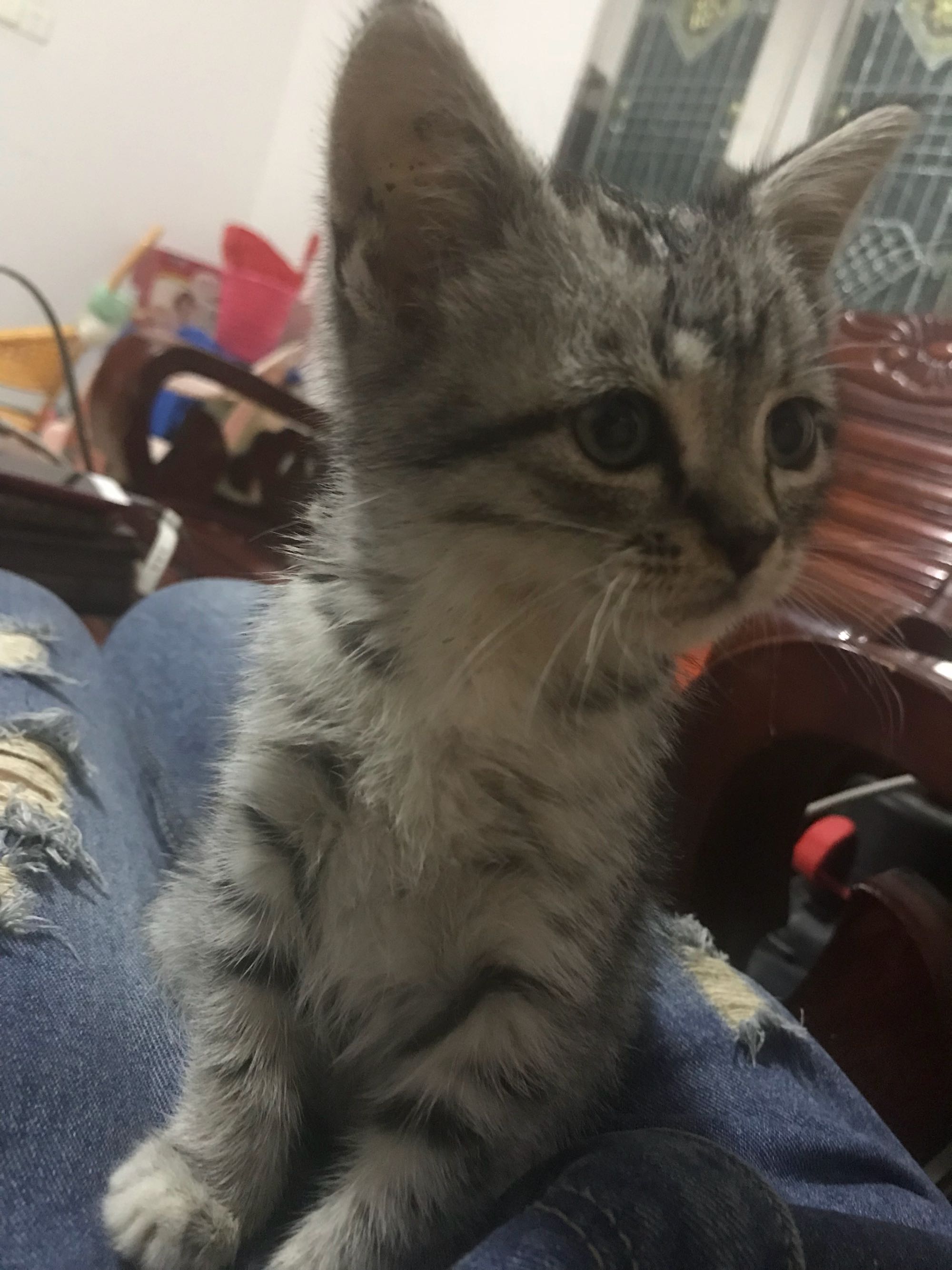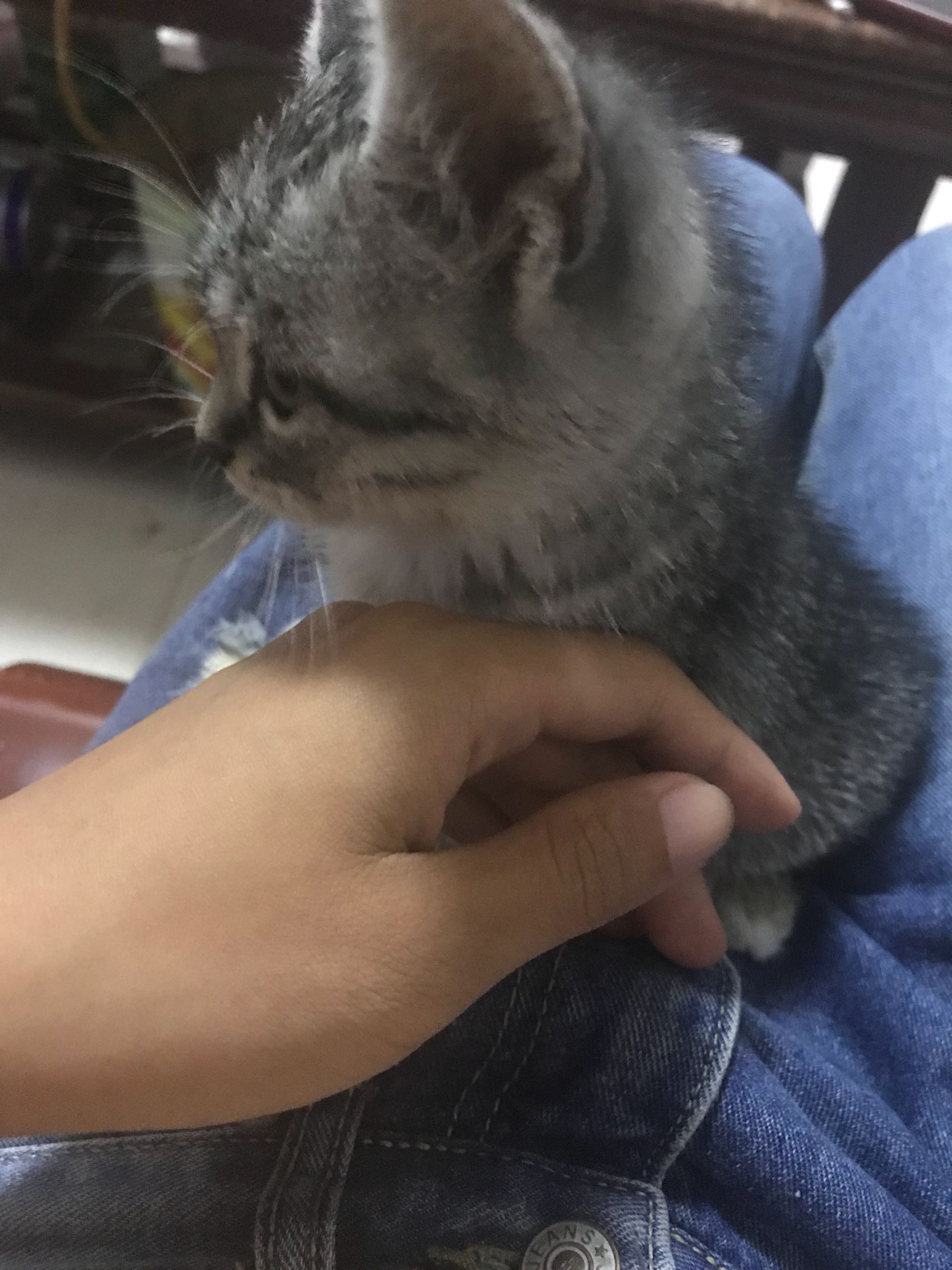 ,张。猫三个月大,不怕生,温顺,亲近人。前爪子肉垫是黑色,尾巴有折。