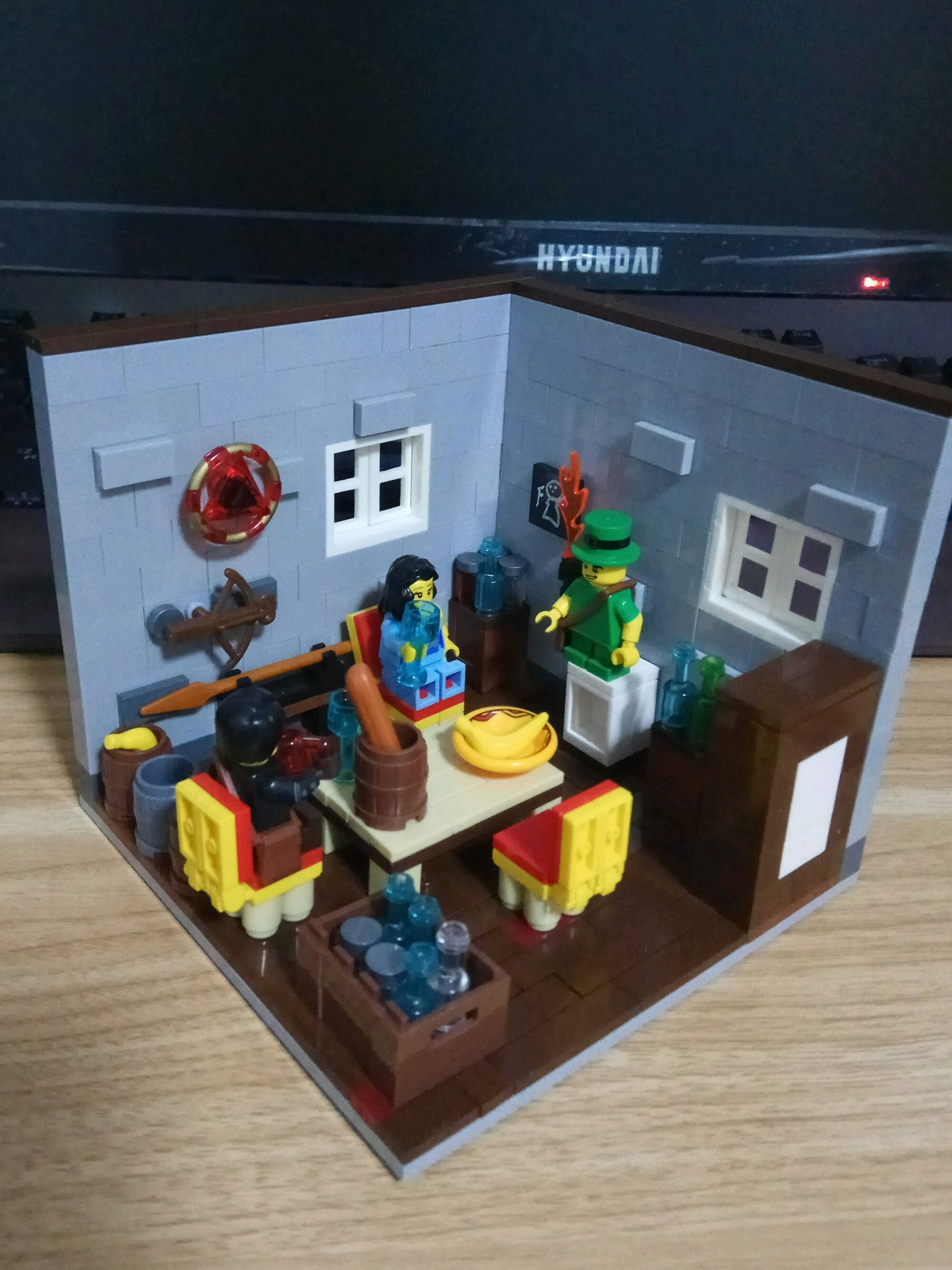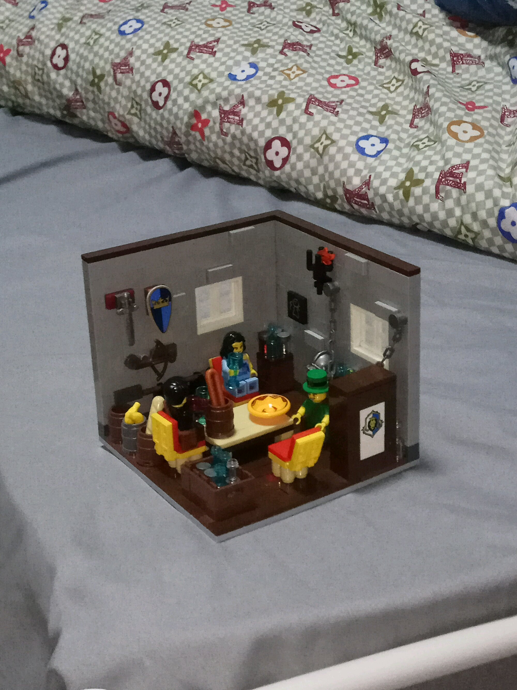 先来说说颜色的搭配,颜色的话参考现实配色,木色地板灰色墙壁,我的构思是一个16世纪的家庭餐厅,所以整个房间里面基本没有采用现代元素,电器之类的通通没有。人仔的话用那种印刷图案比较简单的,毕竟手头上简单一些的就这几个了。