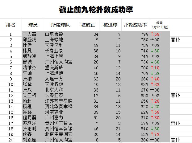 截至第九轮各队门将扑救成功率