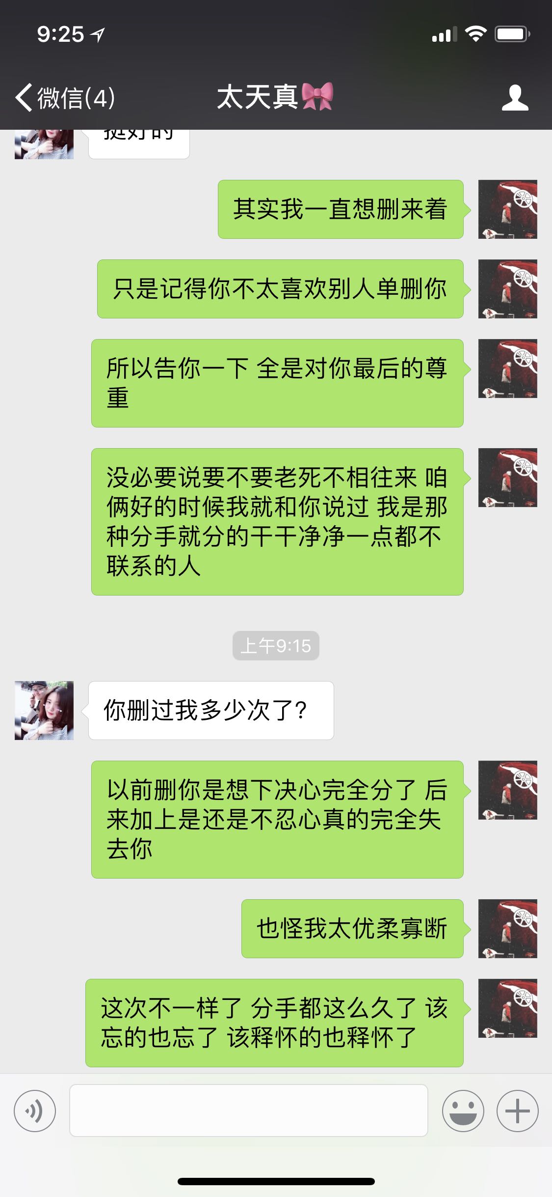 还是想说。删别人很不礼貌。哪怕你有很多理由。好像你删了人家很多次。既然是和平分手。没必要搞得这样。告诉她不代表你给她尊重。更让她感到难堪。意见。没别的意思