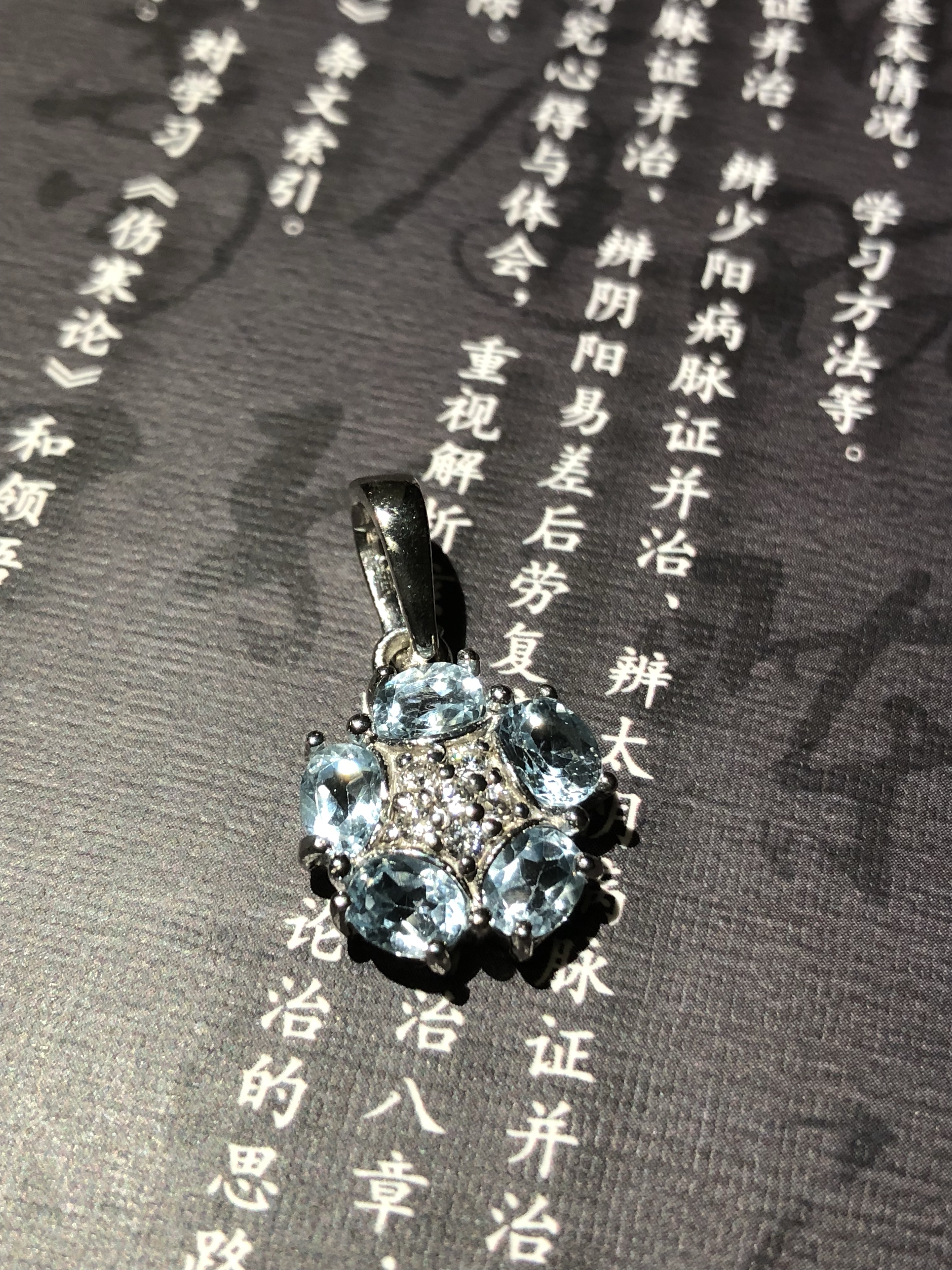 天然top瑞士蓝托帕石s925银吊坠(全新) 主石:瑞士蓝托帕石。颜色非常好,净度很高。灯下看起来很闪,都有点伦敦蓝了。但是那是灯光的效果啊。自然光是瑞士蓝。由于我白天上班,最近周末又很忙,没时间拍自然光图。如果需要自然光图,联系我吧,我想办法拍拍看。