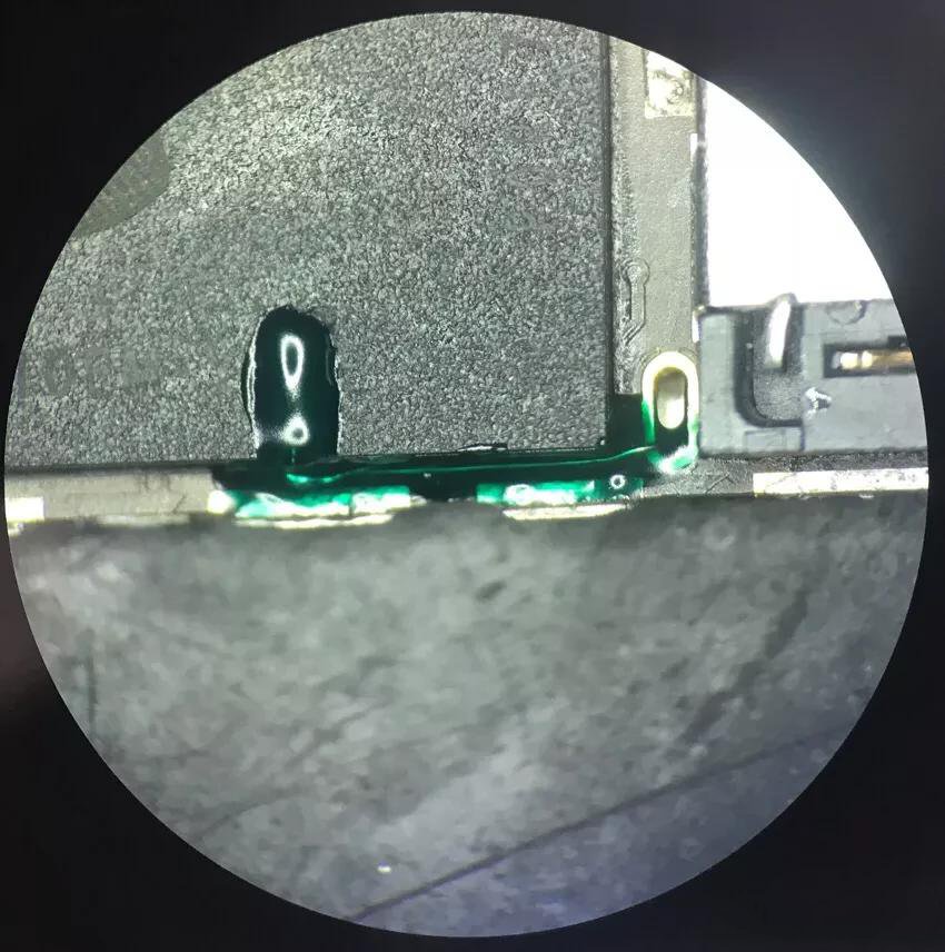 收到网友一台iPhone6Plus,问题描述是经常重启,而且充不进电,拿到手机先连电脑发现电池无数据,电池无数据的话,手机检测不到,肯定会重启,更换多块电池还是不行,测量电池检测脚阻值正常,拆掉充电IC量底脚阻值发现G1脚没有阻值,通过点位图发现G1脚直通CPU,那肯定不是CPU虚焊就是板层断线,先尝试用电阻修复,结果不行,那就直接把CPU挖开,然后飞线实现免拆CPU修复,飞好线连上电脑发现电池已经有数据,测试不会再重启,故障解决。