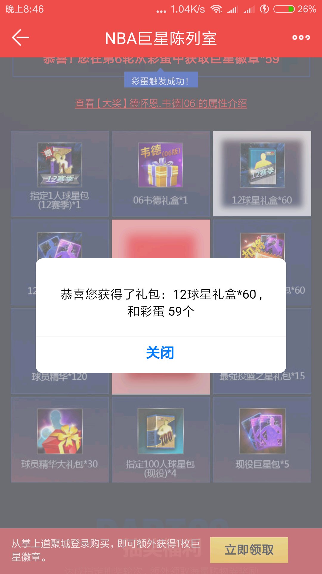 我7轮开了4900精华,嫌精华少,还没触发彩蛋和抽到60个最强扣将包,就再干一轮,谁知出了韦德