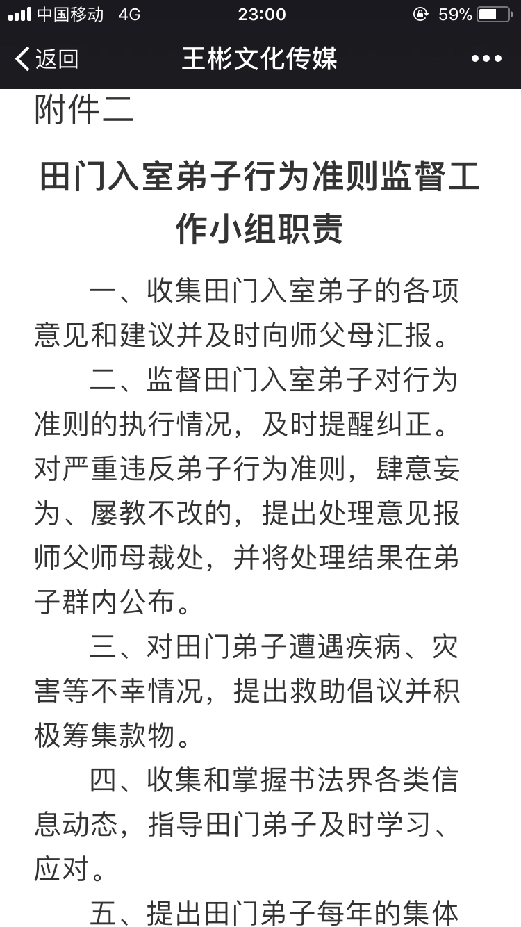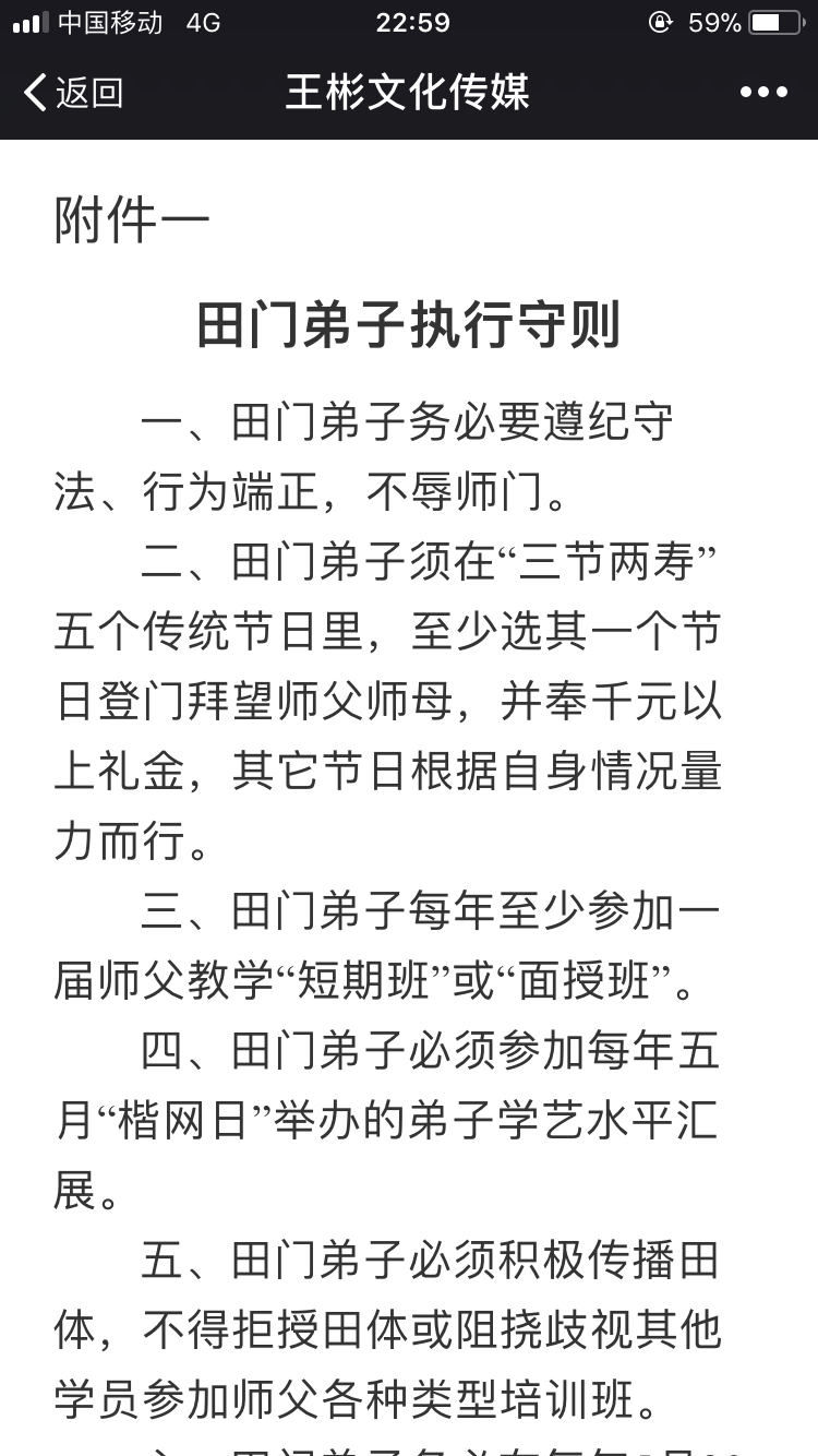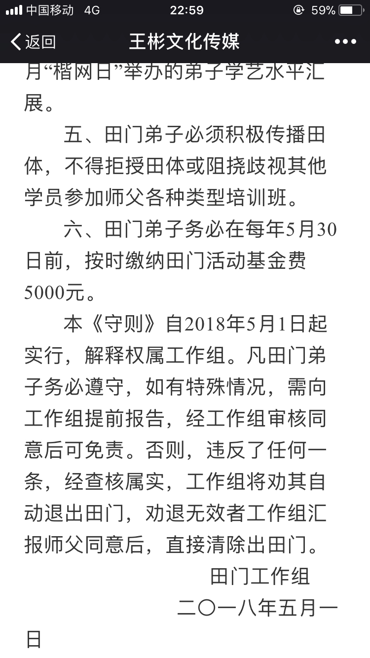 尊敬的师父,尊敬的师兄弟姐妹们,根据田门弟子行为准则第六条之规定,根据师父近几年的表现和一些行为,王彬实在不敢苟同,我决定从即日起退出田门,解除师徒关系,从现在开始三天之内,全国各个田楷书法艺术研究院及田楷书学研究会断匾解散,特此公布于众。古人云,师徒如父如子,回忆八年来的艰苦跟随,我做到了如父,至于如子我就不敢恭维啦,相信大部分弟子和我亦有同感,我感觉这八年活的好累好累,每天都战战兢兢,如履薄冰,好担惊受怕呀,不知什么时候像碾死蚂蚁一样被清门,我们学习书法就是在学习中国的传统美德和操行,行为皆有美丑,那么我想问一问,磕头弟子上课同社会招生一样的学费美吗?肆意开除徒弟美吗?所有的活动都与利益挂钩美吗?每年收的师徒费美吗?霸王弟子规美吗?特别是提倡收徒“合同制”不但不美,更不符合中国人的道德伦理吧,这些根本就谈不上美。我从拜师的那天起,就承担起传承田楷的义务,在全国设立多家分支机构,每次我的大小活动都会把师父举过头顶,而且在八年里,耗资超过50万元,我并不需要感谢,最起码知情吧。八年里,我为师父做的一切永不后悔,都是为徒期间应尽的义务和责任,众人皆知我是一个忠实轿夫,常言道官儿不打送礼的,老爷不打抬轿的,边挨打边抬轿我吃不消,一个忠实的轿夫被主人把腿打断喽,这轿真的抬不动喽,当然会有别人替我抬轿,师父的至理名言是铁打的营盘流水的兵,师父开除每一个徒弟,就像碾死一个蚂蚁一样,,这样好吗?这样公平吗?这是大家风范吗?我和俊奎弟弟的一次长时间沟通,莫名其妙的开除很可怜,这么好的人竟然被开除还会有好人吗,真叫人无语,尊敬的师父,醒醒吧,不要把良言当成恶语,我们不想走在街上叫人家骂着说这是XXⅩ的徒弟,请听听我曾经是徒弟的一句良言吧,光写好字是不够的,更成不了大家,中石先生,启功先生,刘炳森先生,田蕴章先生才是当今的表率,是大师。,钱呀,真是害人的纸