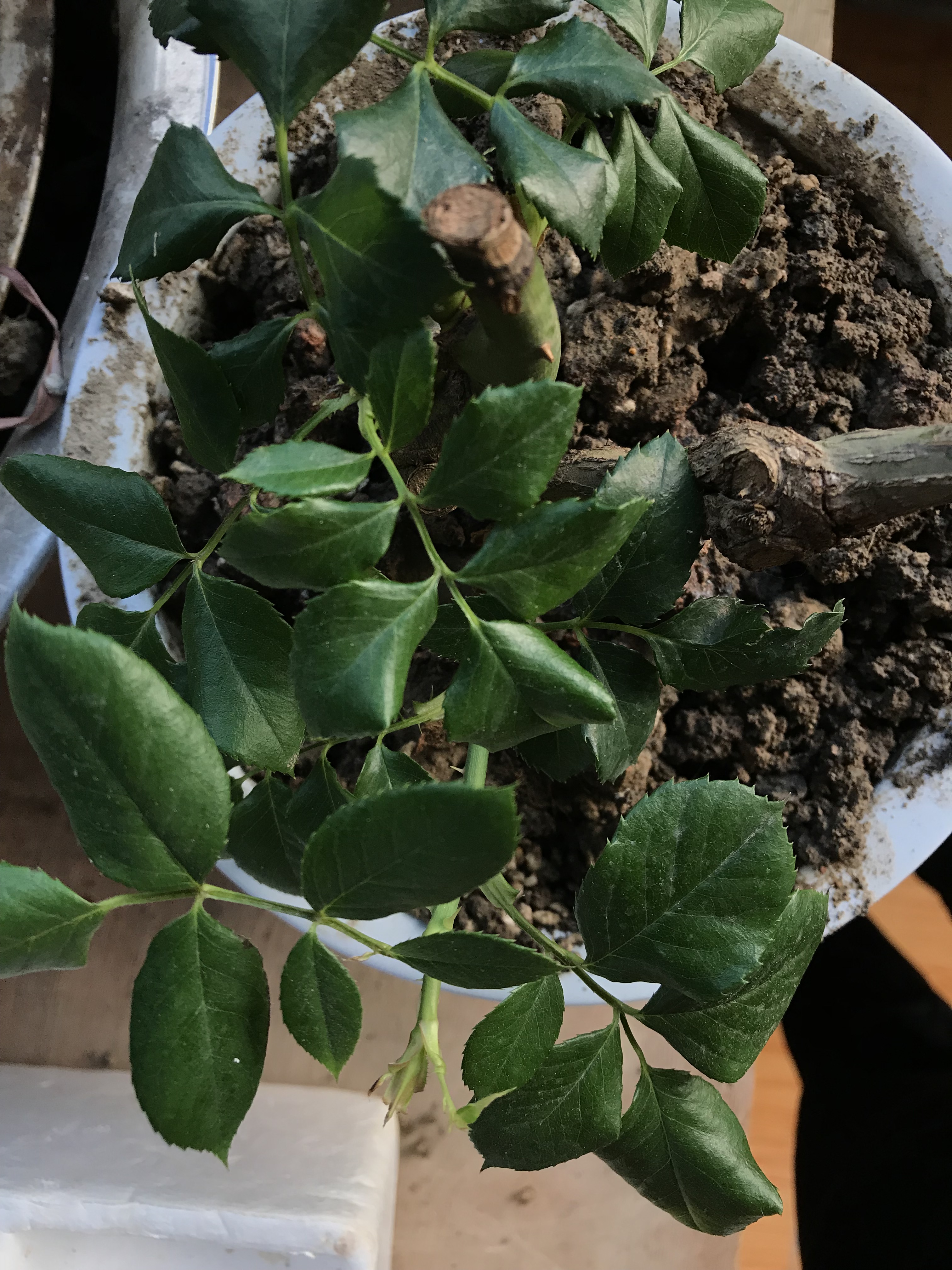 玫瑰叶子开始弯曲,新爆出的芽也枯死了,停止生长了。上面截面,开始发黑。