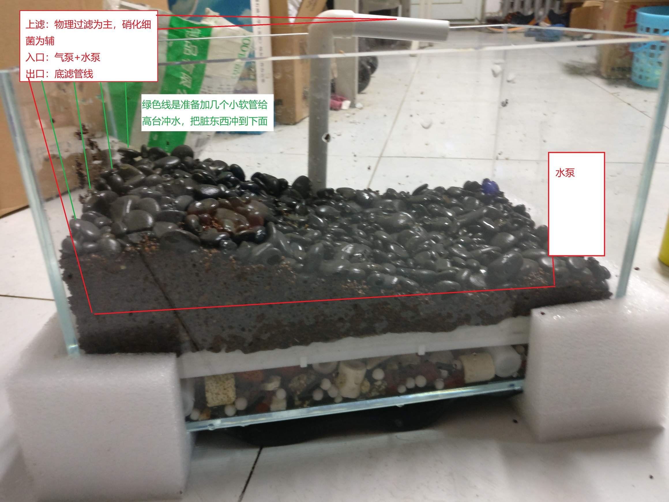 大体结构是底滤+过滤棉+湖砂+铁胆沙,湖砂最厚的地方大约有5-8cm的样子,上面准备再3D打印一个小的物理过滤器和硝化细菌盒,从上面加气泵,水、气在上部混合后两相流往底滤上压。不知道有没有人这样试过,沿程水头损失大不大,普通的1.8W水泵能不能带动。如果水头损失大的话,排量上不去,氧气可能会逆着水柱往回走。。。Orz。。没用软件模拟,建模太麻烦。。。有么有大神做过类似的。。。或者大神指导一下这个想法的可行性。。