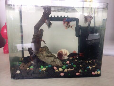 我的是小缸,养的有彩虹鲨、虎皮、黑裙鱼和斗鱼