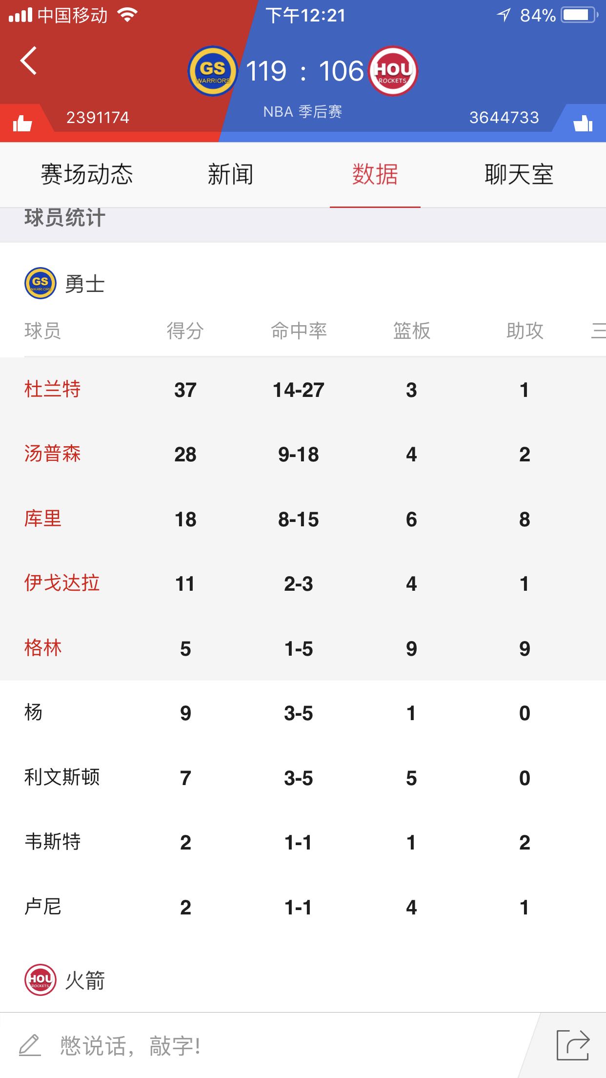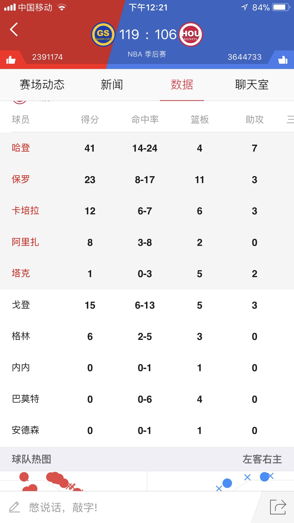 来吧,数据说话,两场球的数据,我觉得火箭还有戏!