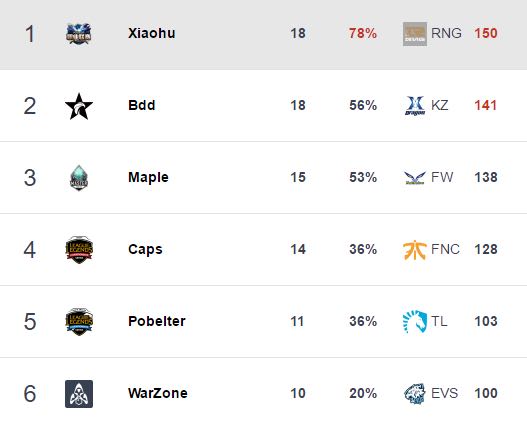 至于小狗打了18局比赛还能有215分是多么恐怖的存在——可以给大家用春季赛每周更新的LCK选手评分对比一下,ADC们的常规赛评分基本在170左右,各赛区能达到200分以上的只有季后赛出场不足10场的评分。