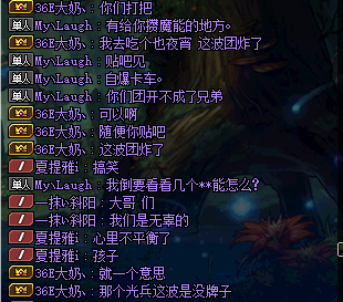 后来一队c看不下去了,于是就带她过图,然后团长他们看不起了,开始炸团了,说暗路线不打了。