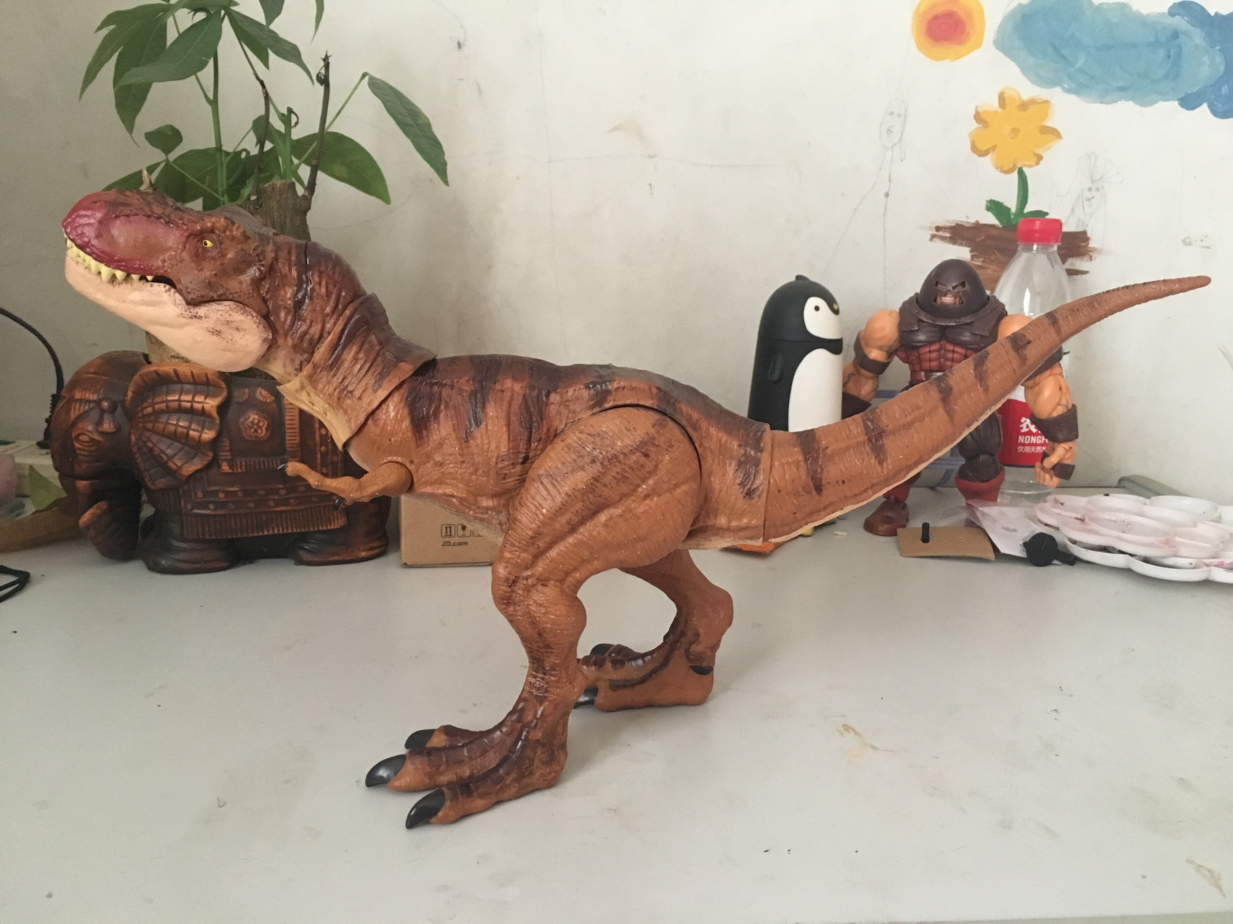 首先要介绍的当然是主角Rexy,身边没有尺子,不过官方给的尺寸是体长50.8cm,因为脖子的可动,霸王龙可以做出抬头的动作,因为定位是儿童玩具的缘故,头身比并不是非常精确,头部和脚部显得有点大,不过不管任何姿势都能站的非常稳