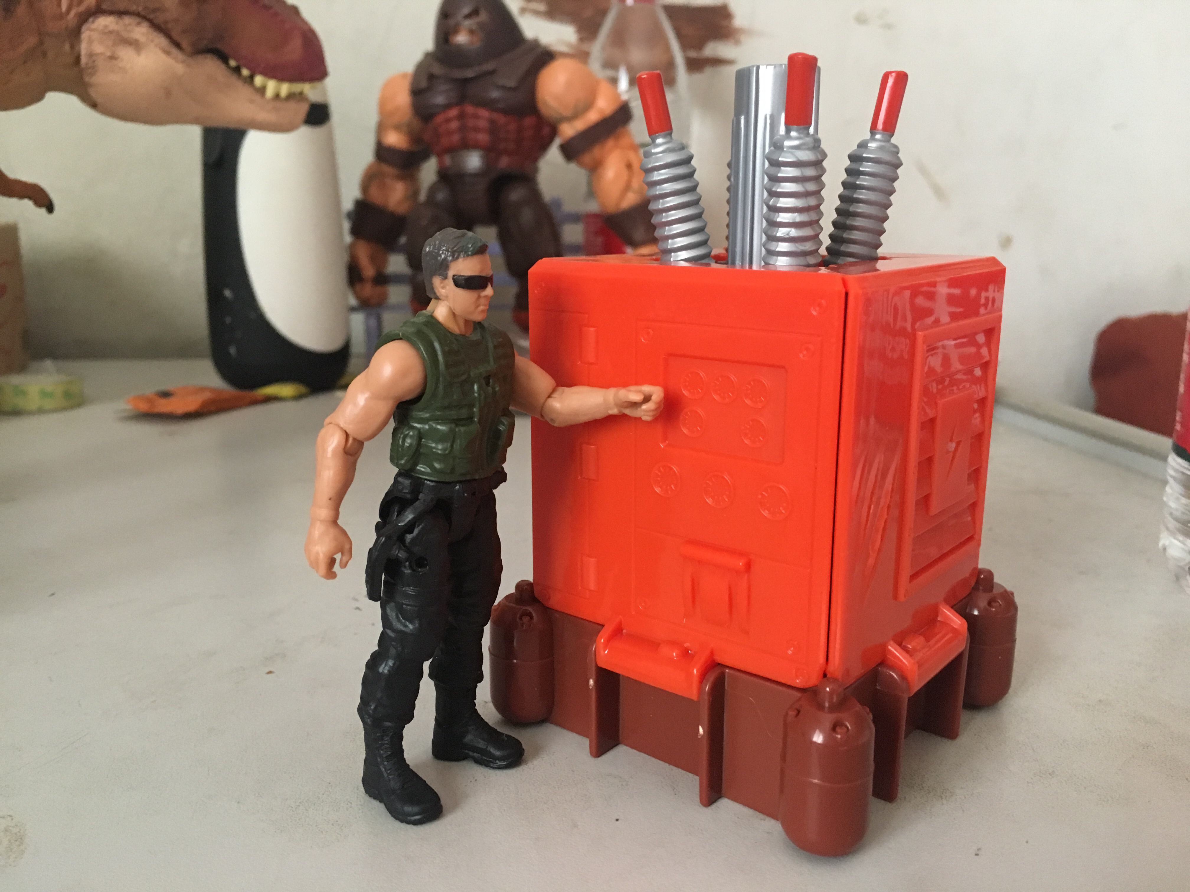 接下来看场景玩具和人偶,人偶并没有具体身份,应该是电影中的雇佣兵,场景是个发电机,上面的图案没有任何涂装