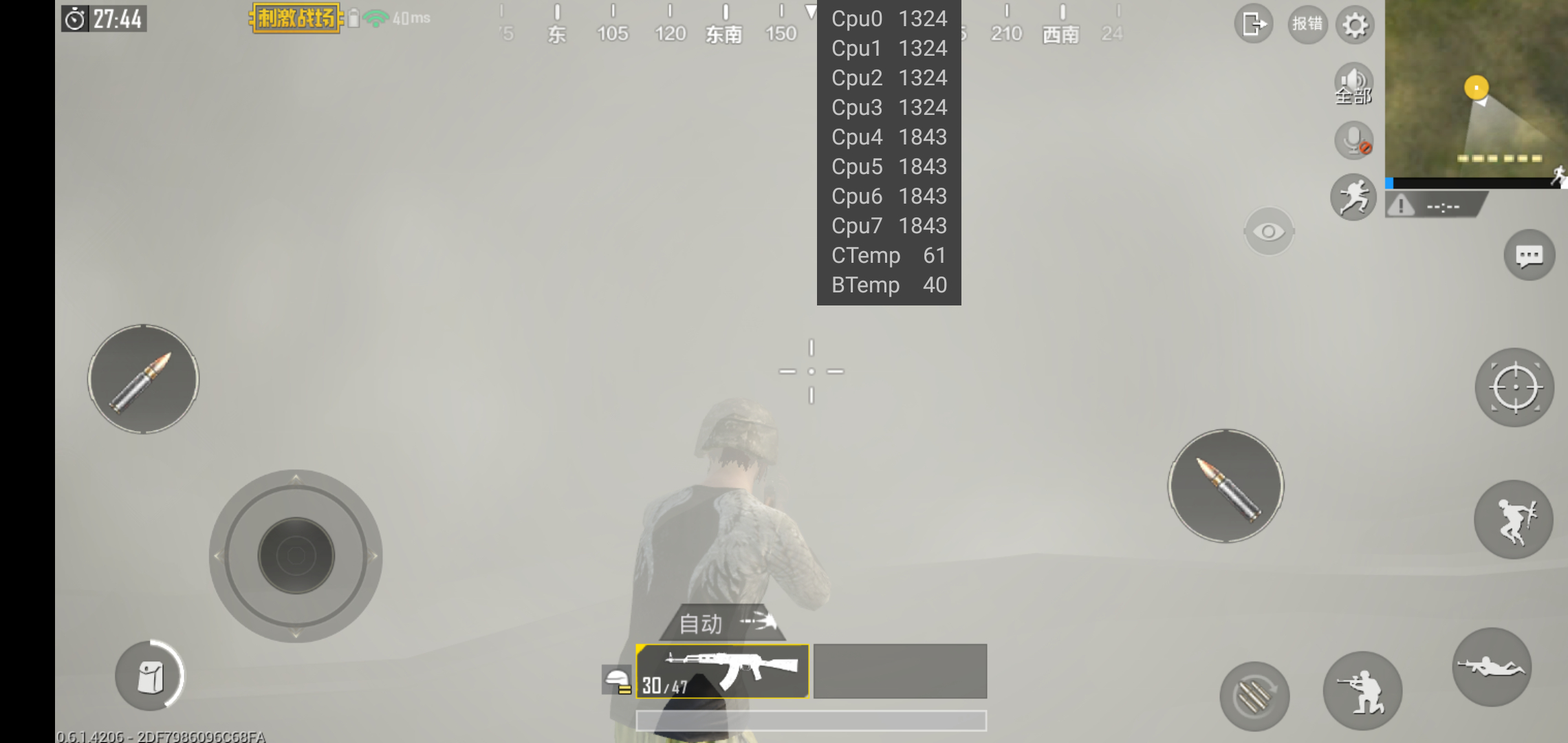 接下来吃鸡。特效全开+抗锯齿。个人没有感觉到明显的效能变化。频率2.0-2.8g。都是一些特定的地点,包括5颗烟雾,CPU频率瞬间下降了。总体60帧伴随着大大小小的帧数下降(个人感觉),主要集中在广场,跳伞(十分剧烈的卡顿),城区转头(持续性的帧数降低和掉帧,有可能是优化或者一加触摸问题)。