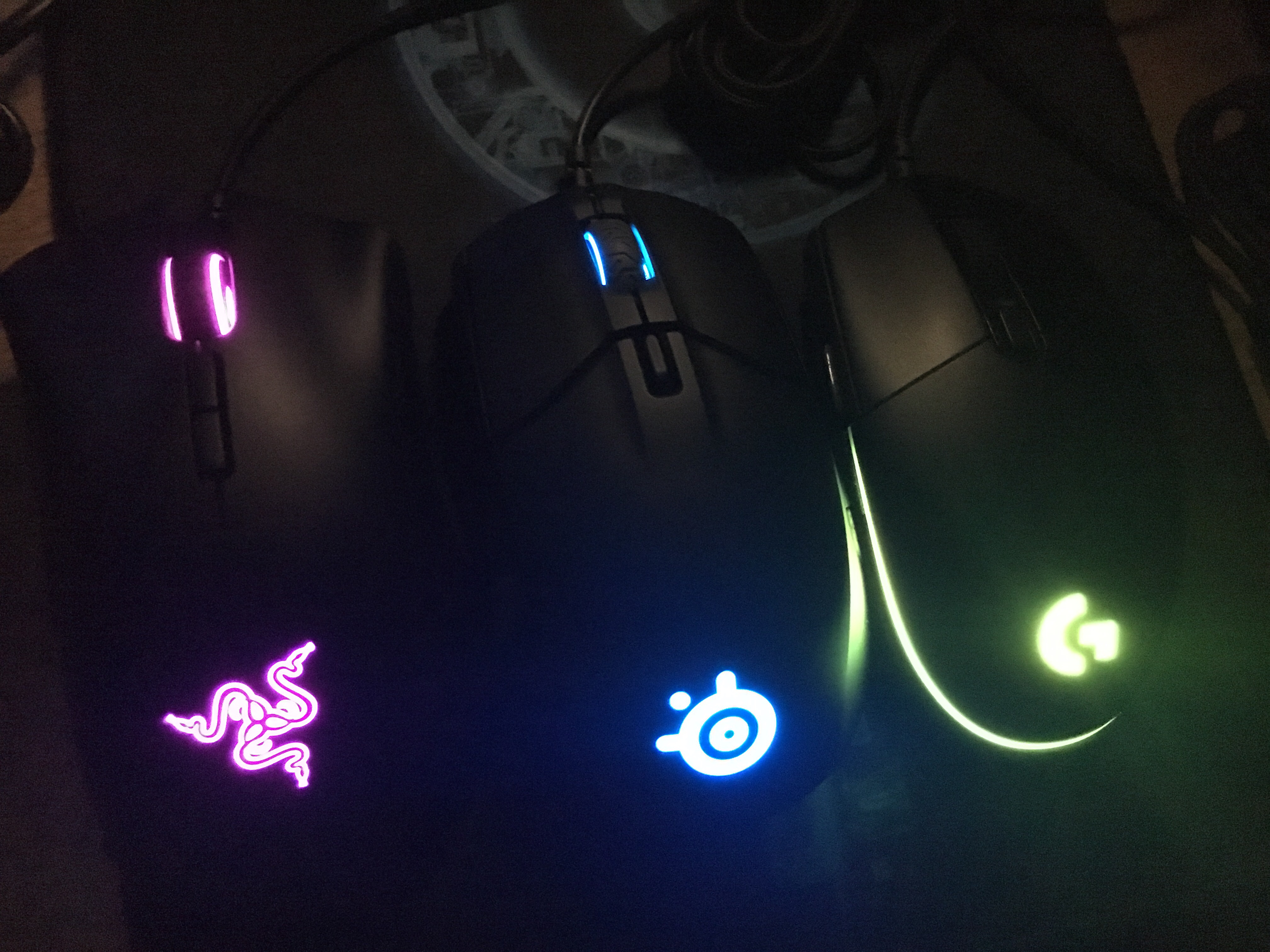 从左到右,雷蛇炼狱蝰蛇精英版,赛睿sensei310,罗技G PRO