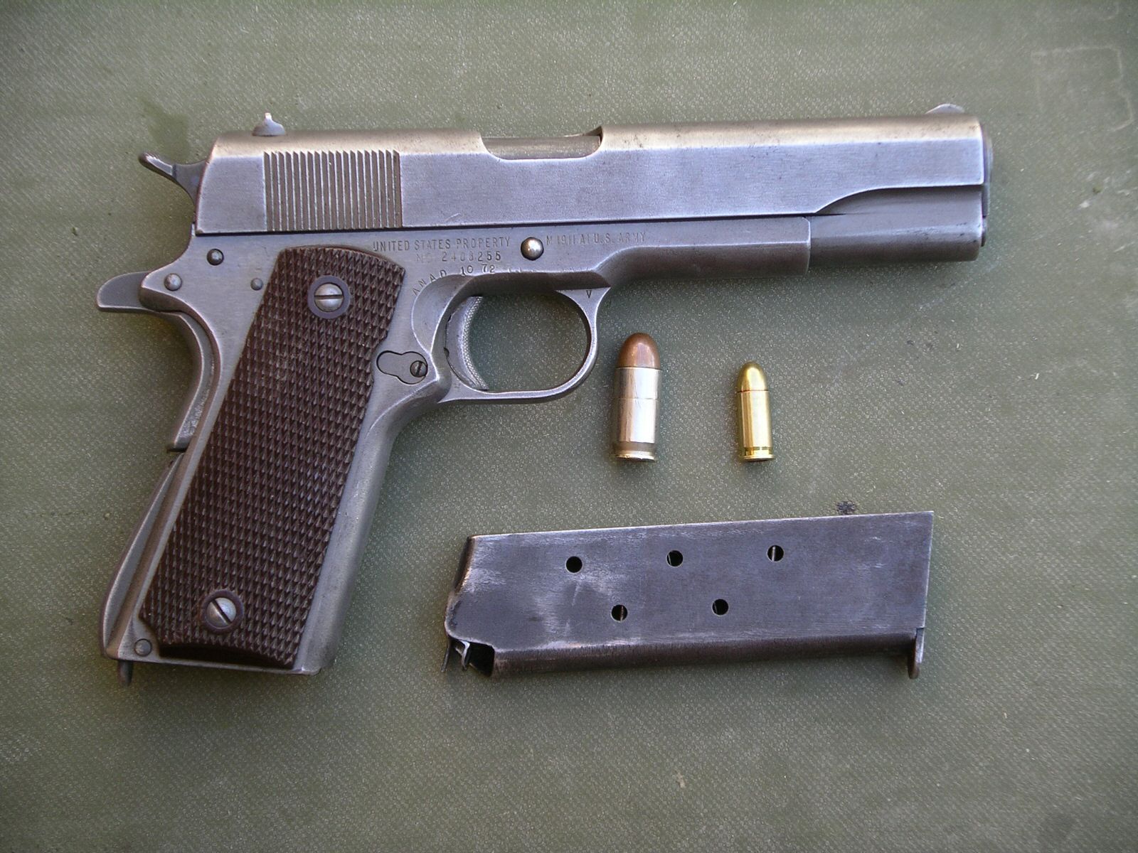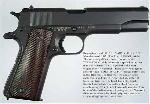 这些手枪的底把上都印上了“美国财产”(UNITED STATES PROPERTY)的标记,套筒上的铭文有“美国陆军1911型”(MODEL OF 1911 U.S. ARMY)的文字。当第一次世界大战开始时就加速生产,直到1918年5月之前,生产速度增加到每天1,000把,在1918年夏季试过增加到每天2,200把。