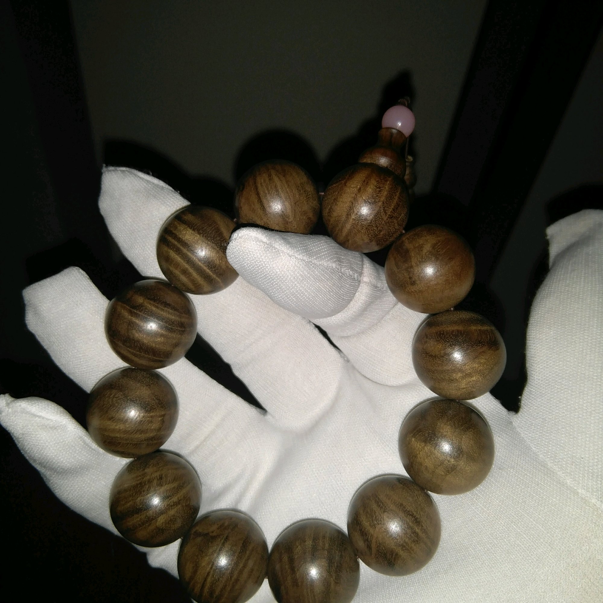 这串是阴沉料,盘了一个多月,已经开始长包浆了,有硬伤总觉得不舒服,送去打磨的,老板说不抛光,盘的过程慢慢就光洁了,出来效果也好,这是之前的图片