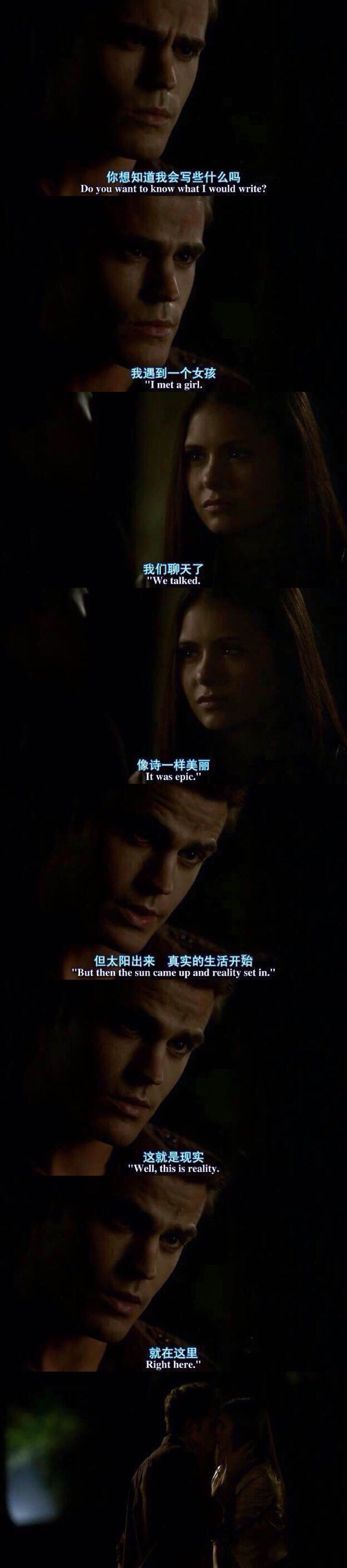 最近又回头看了吸血鬼日记,第一次看的时候呢,是被女主的颜值惊艳到,也可能因为女主的颜值,让我忽略了其实男主也很帅。其实第一次看的时候并没有特别喜欢stefan甚至感觉他是因为还很喜欢Katherine才那样,但是第二次,我才明白,为Katherine驻足不前的只有前面几集的Damon,stefan对Elina的爱很纯粹,他会不惜一切去保护她,把她当成他这辈子唯一的公主,无论她怎么选择都尊重她,保护着她想保护的每一个。后来,为了救哥哥,stefan放弃了自己本该美好的生活,只能深夜偷偷给Elina打电话且在电话那头默不作声,他在尽他所能,保护着这些他爱的人。起初,Elina坚信着那点希望,希望她爱的那个stefan能回到她身边,还能像从前那样深情地看着她说I love you,但失去人性的stefan一次次把她推开,这时Damon渐渐进入了Elina的世界,改变着Elina的世界观,改变着Elina对他的感觉。恢复人性的stefan失落,无奈,一次次受伤,一次次惹人心疼,我们的stefan。