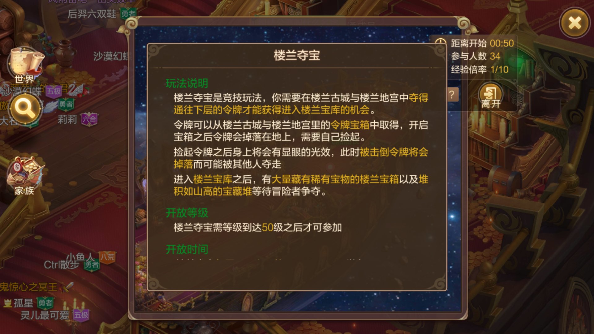活动开始可通过活动页面传送到一个叫前往楼兰的飞船的地图,玩家会在这个地图有5分钟的等待时间,这5分钟时间内会自动获得经验加成,效果和家族酒会差不多吧。值得一提的是,这个活动也是分等级限制的,69级、89级等等。