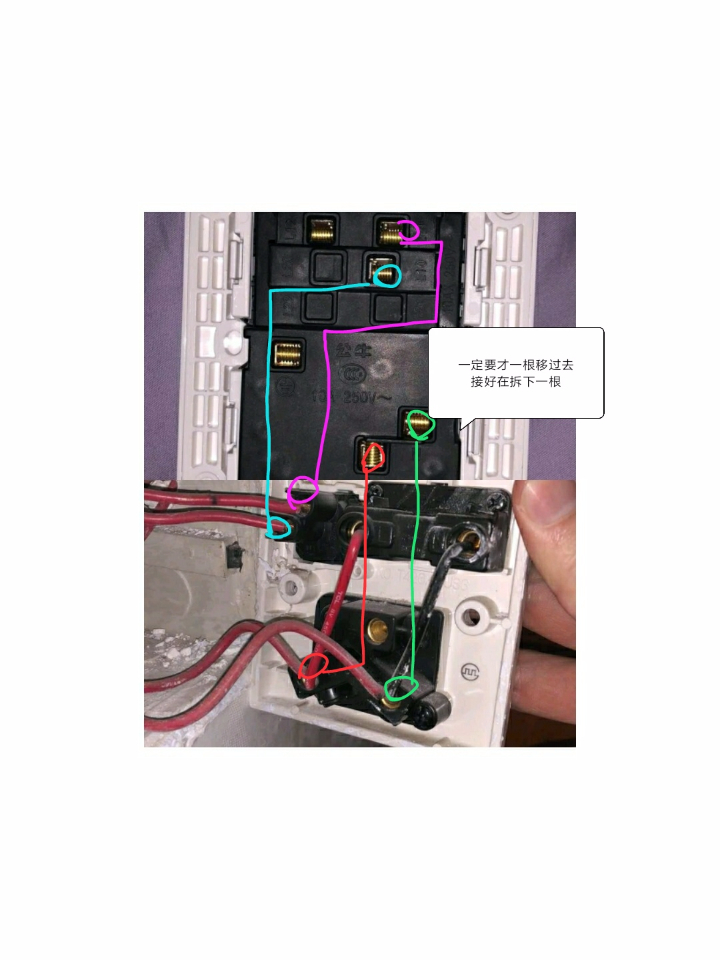 那两根挨在一起的接新开关上面的L10.和L11,再把原插座上面的两根接到新的上面就可以