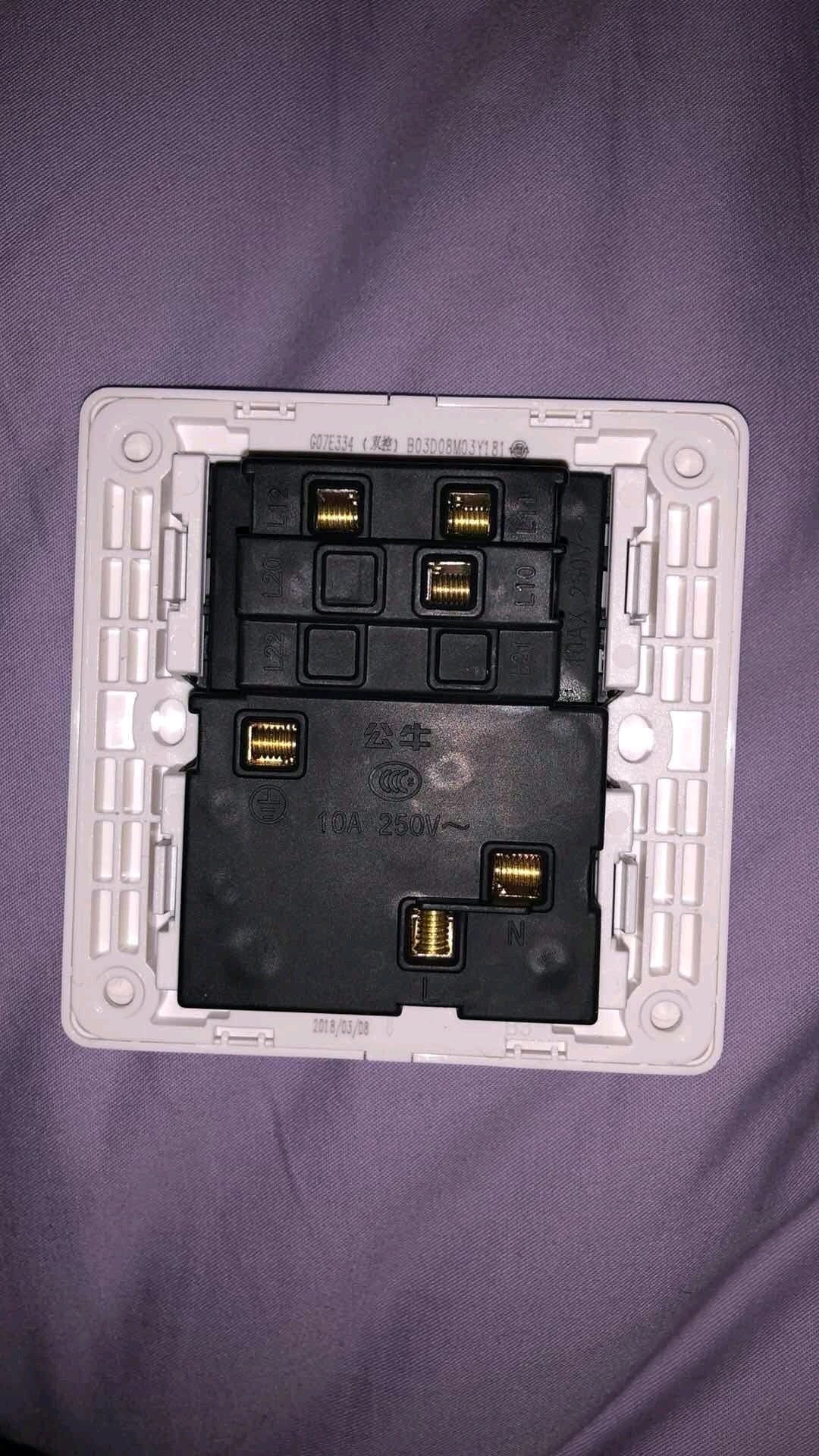 看你第一图有4根线,那两个短的可以不用。不懂原理的话你先用电笔验电,火线亮控制线不亮,火线接L1,控制线接L11或L12都可以,试验灯是否亮。再接第二组,是插座,火零随便接。你的是一开双控加插座,这个不难。记住,不懂原理的话必须拆一组接一组,别一次性都拆。