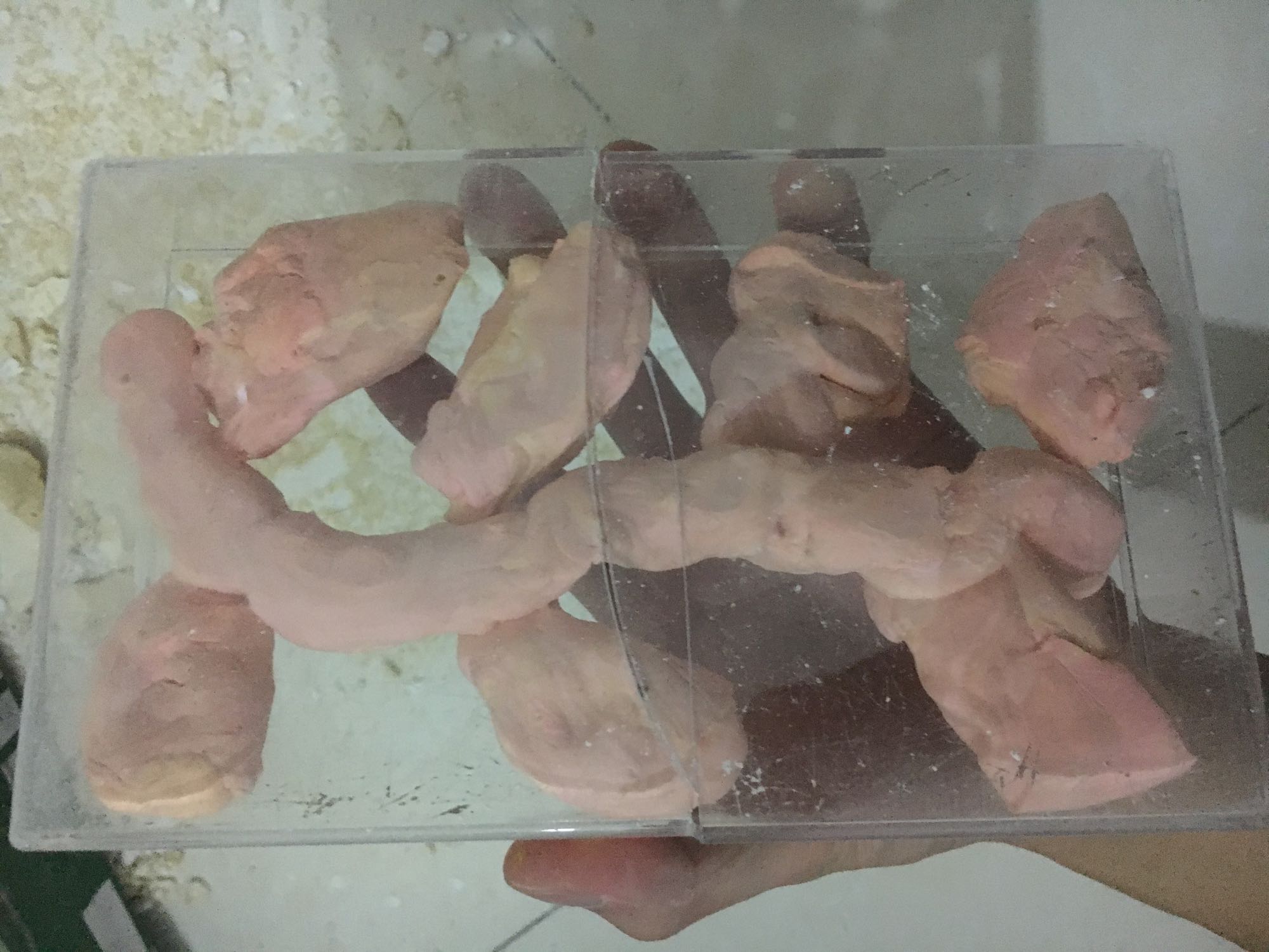 关键的一点来了,取橡皮泥有技巧,沿着橡皮泥最边缘往里搓,就跟你搓汗泥一样,搓到当橡皮泥有一部分与石膏分离时,这是候就可以用手慢慢把橡皮泥沿已分离的开口方向撕下来,耐心一点,很快的。至于盒子钻孔,用带尖头的刀钻,很快就能钻个孔。剩下的就不多说了
