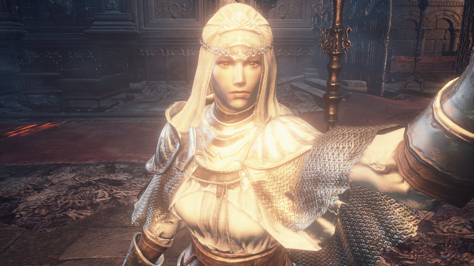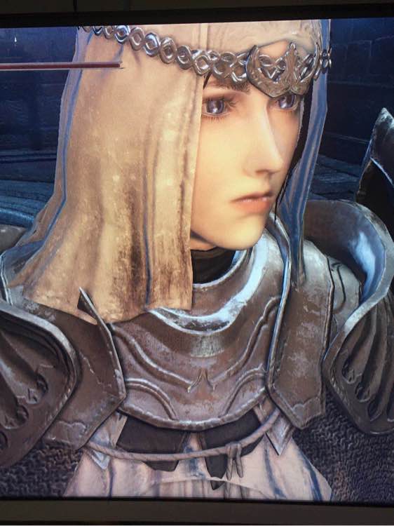 然后闲来无事立马上魂3买了解咒石用掉,差不多的姿势差不多的角度(没法拉远近视角不能做到一模一样了),截图圣地冷冽谷同样篝火前面截了张,发色其实是差不多的,但是魂3号太久远忘记是不是亚斯特拉脸了,反正也是初始脸没捏过