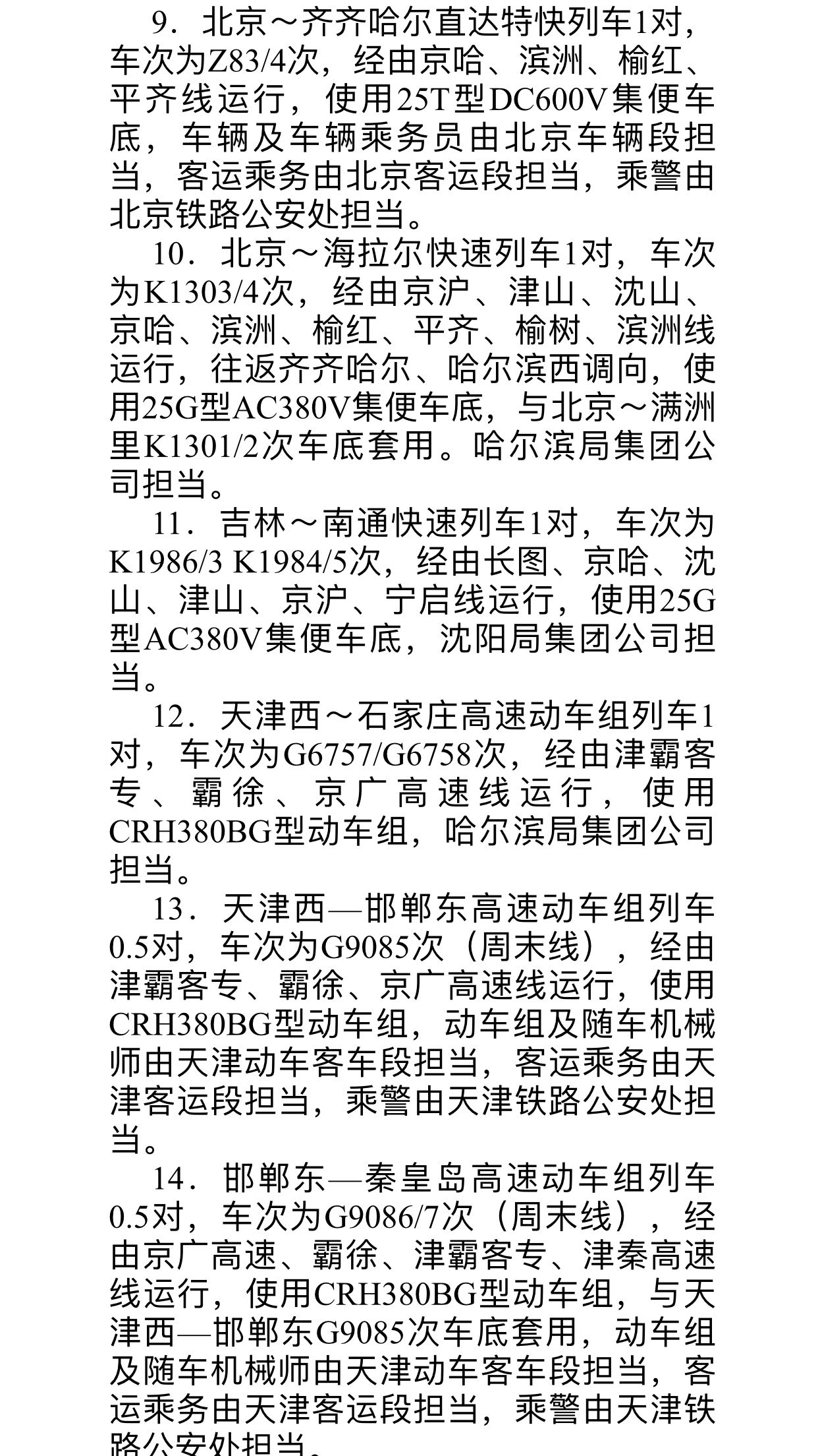 9.哈尔滨东(以下简称“哈东”)-哈尔滨 0K1528 次、哈尔滨- 邯郸 K1528/5 次调整为哈东-哈西 0K1528 次、哈西-邯郸 K1528/5 次运行。